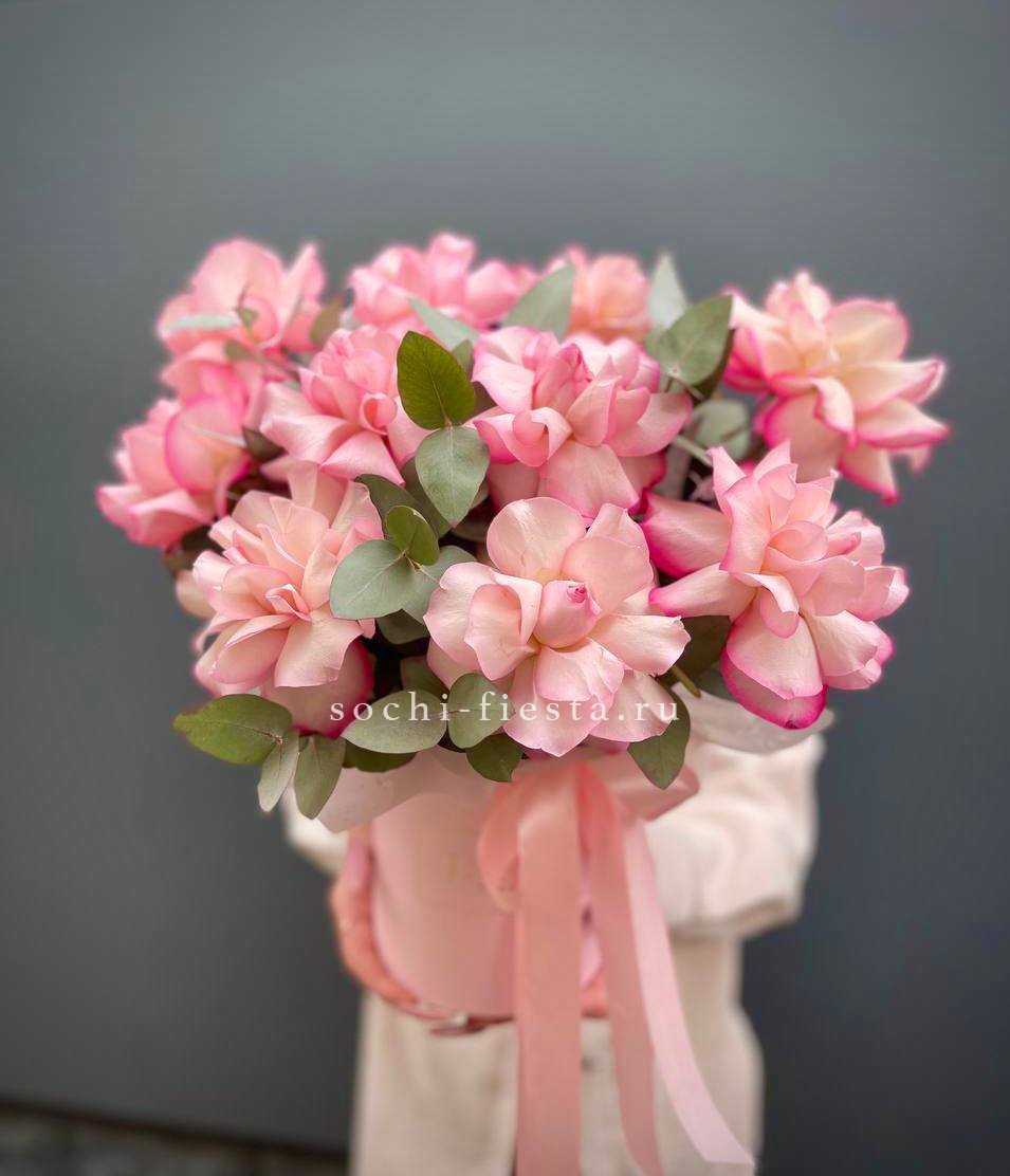 нежный бокс из французских роз сорта Венди, цилиндр D13, эвкалипт, лента, упаковка.
