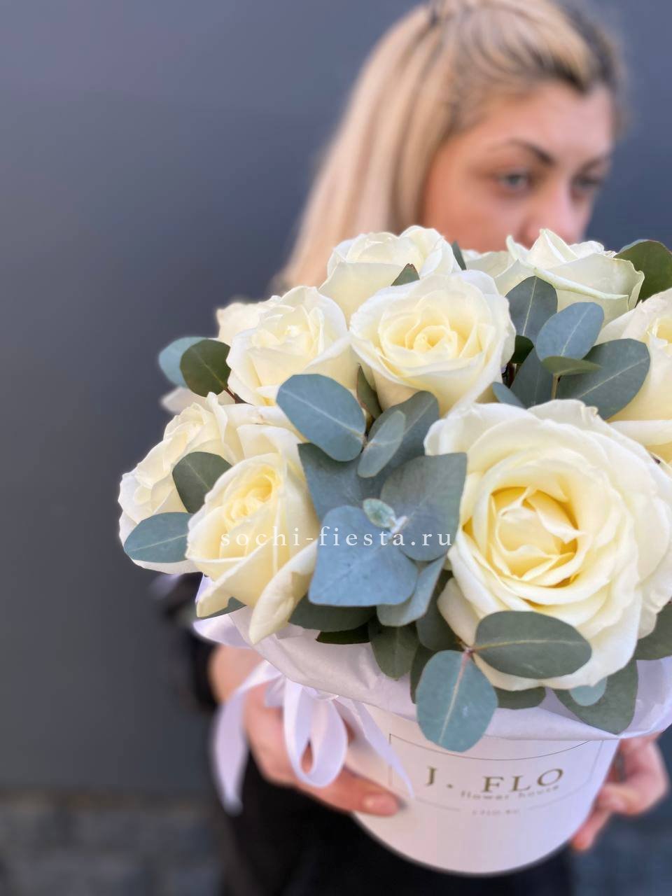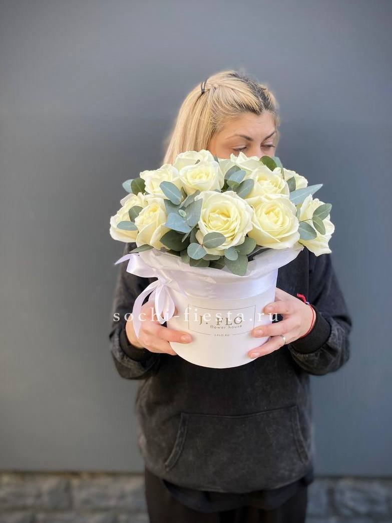 Пятнадцать белых роз собраны в компактный бокс с ветками эвкалипта. Чистая форма и спокойная гамма создают ощущение воздуха и света в любом пространстве.