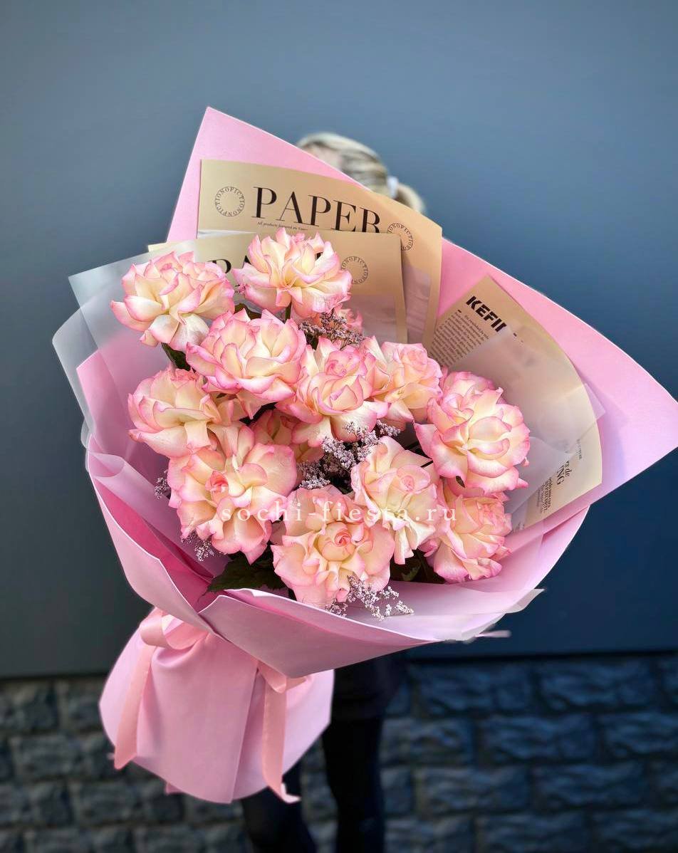 15 роз сорта джумилия, лента, дизайнерская упаковка.