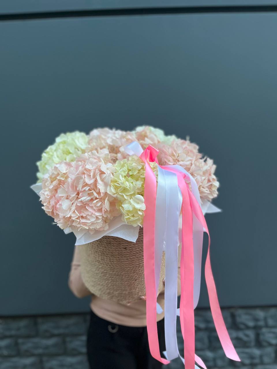 гортензия нежно-розовых оттенков, эустома, львиный зев или маттиола, розовые розы, эвкалипт, вспомогательная зелень, лента, светлая корзин.