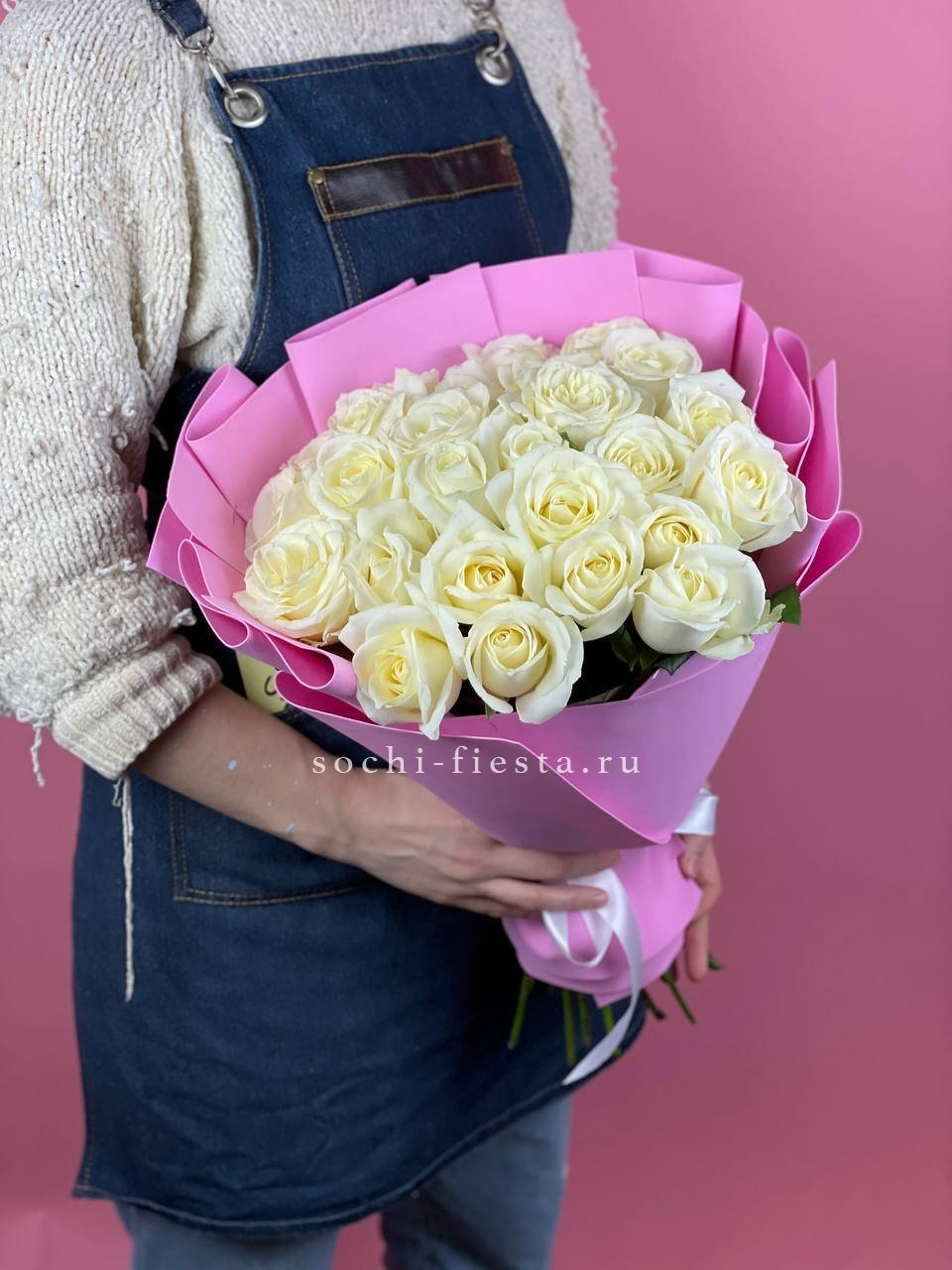 Белоснежные бутоны собраны в лаконичную форму с воздушной текстурой упаковки. Чистота линий и свежесть делают композицию универсальной для любого момента.