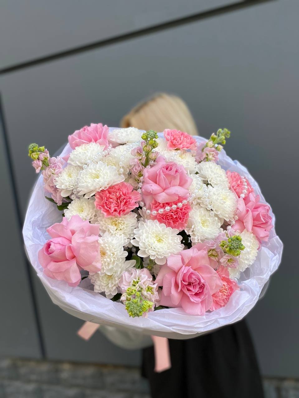 хризантема, маттиола, диантусы, розы с элементами бусин в воздушном оформлении.