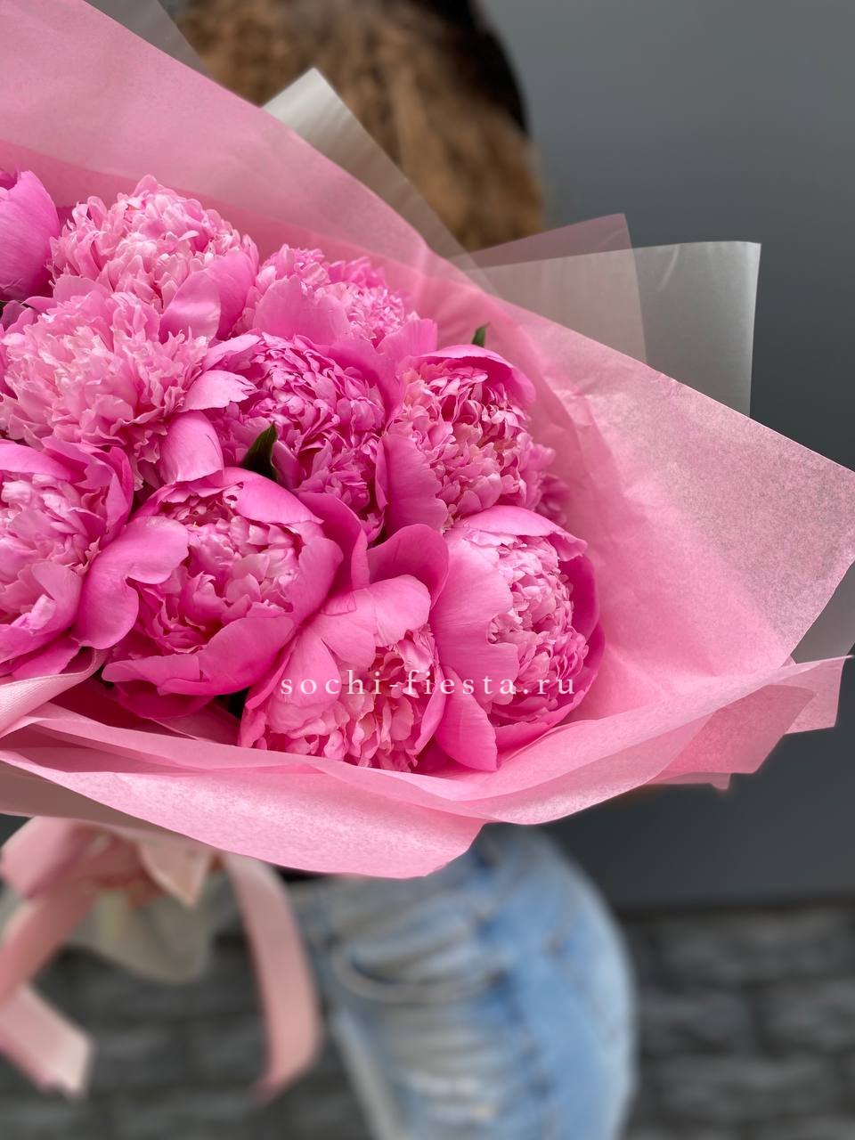 Пионы в воздушной упаковке из тишью создают впечатление лёгкости и движения. Полупрозрачная плёнка мягко обволакивает бутоны, сохраняя их естественную красоту и свежесть.