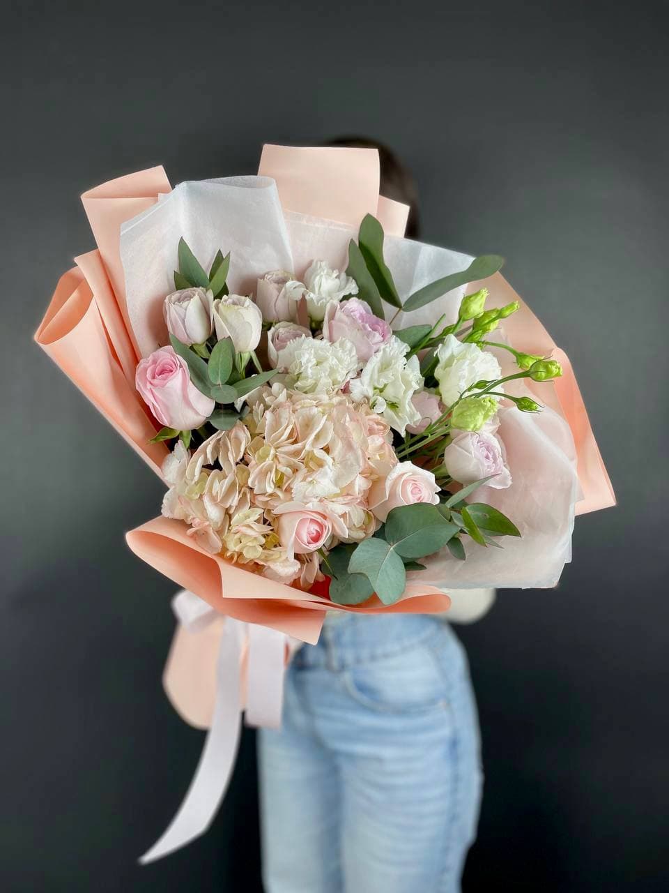 Этот букет — словно облако нежности и мечтательности. Бутончики кустовых роз, напоминающие тугие шарики, имеют светлый кремовый цвет с легким розовым оттенком. В сочетании с веточками свежего эвкалипта они создают атмосферу легкости и романтики. Это идеальный подарок для выражения самых светлых и теплых чувств, который растопит любое сердце.