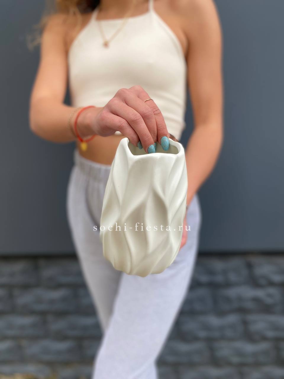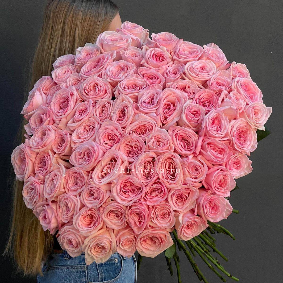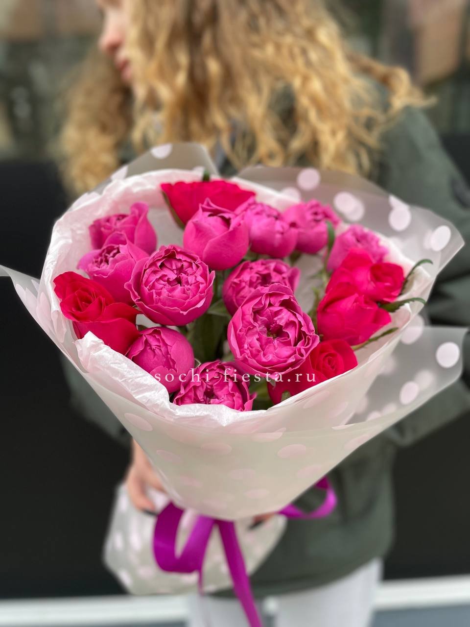 Пионовидные розы раскрываются густыми лепестками, хамелациум добавляет воздушности. Композиция держит форму и долго сохраняет свежесть.