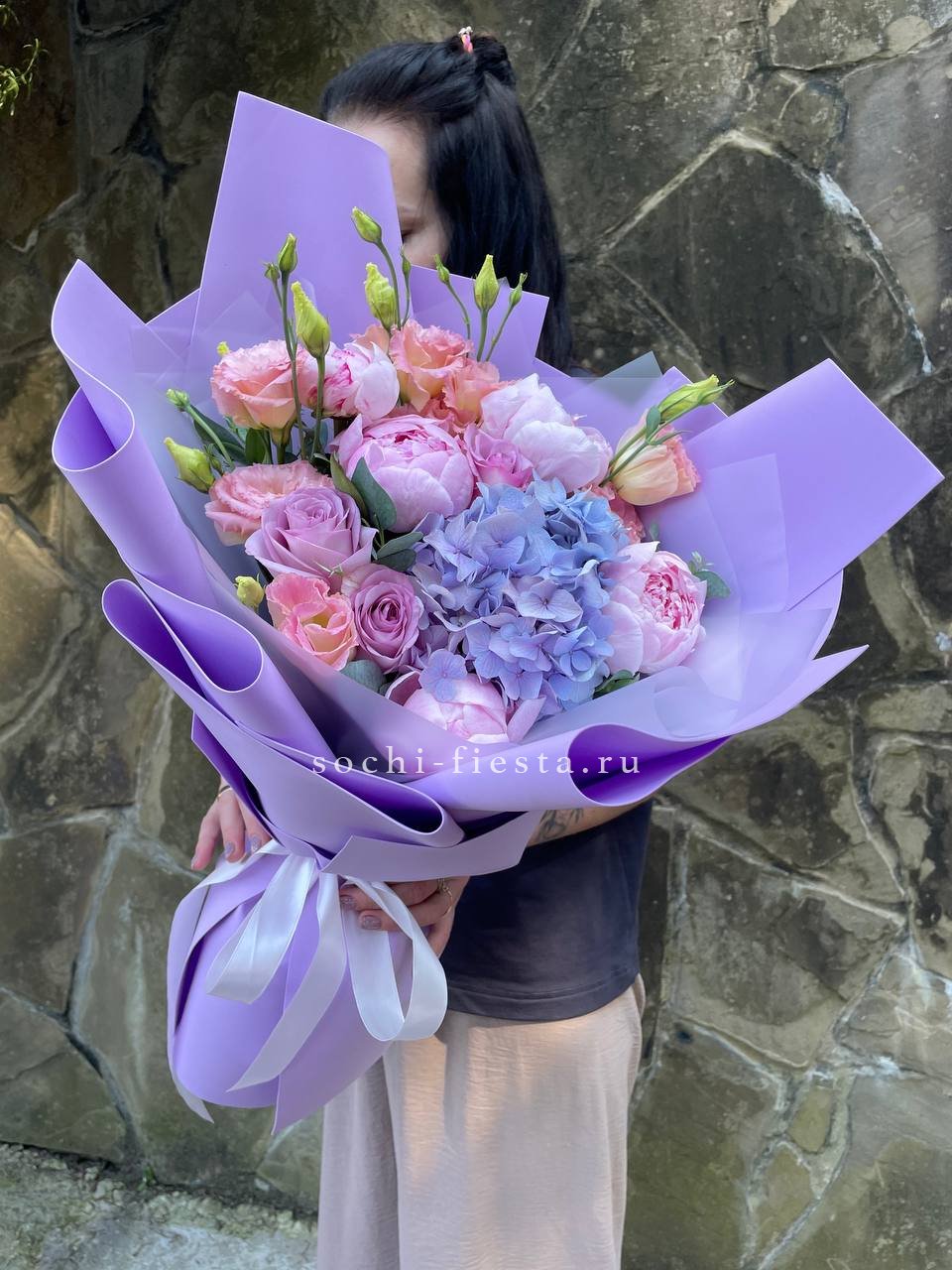 эустома, розовые пионы Сара Бернар, гортензия, розы одноголовые, эвкалипт, лента, дизайнерская упаковка.