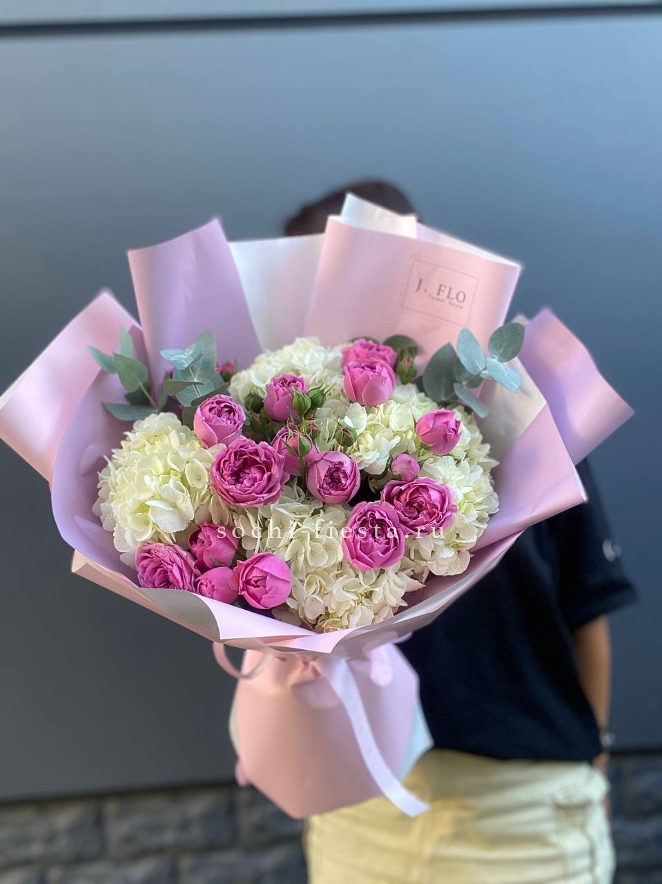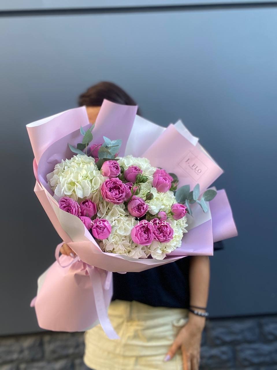 гортензия, эустома, кустовая роза, диантус, лента, упаковка Состав букета в несозон может нести незначительные изменения.
