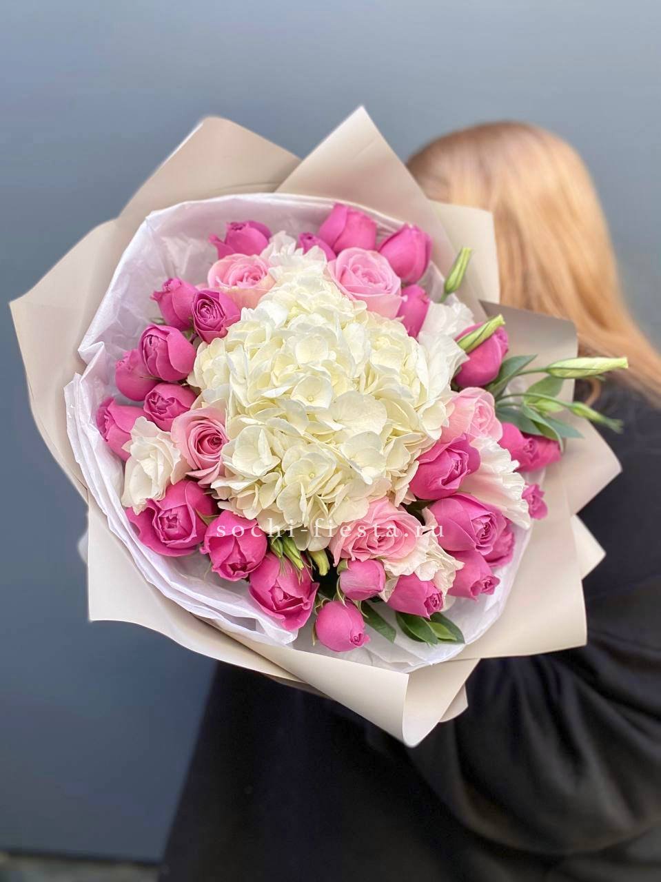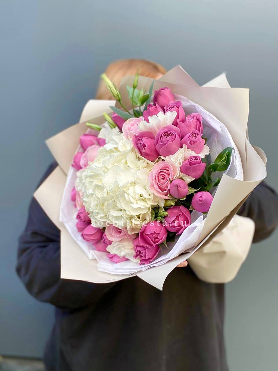 гортензия белая, роза одноголовая, роза кустовая, пионовидная роза Мисти Баблс, эустома тишью, упаковка, лента.