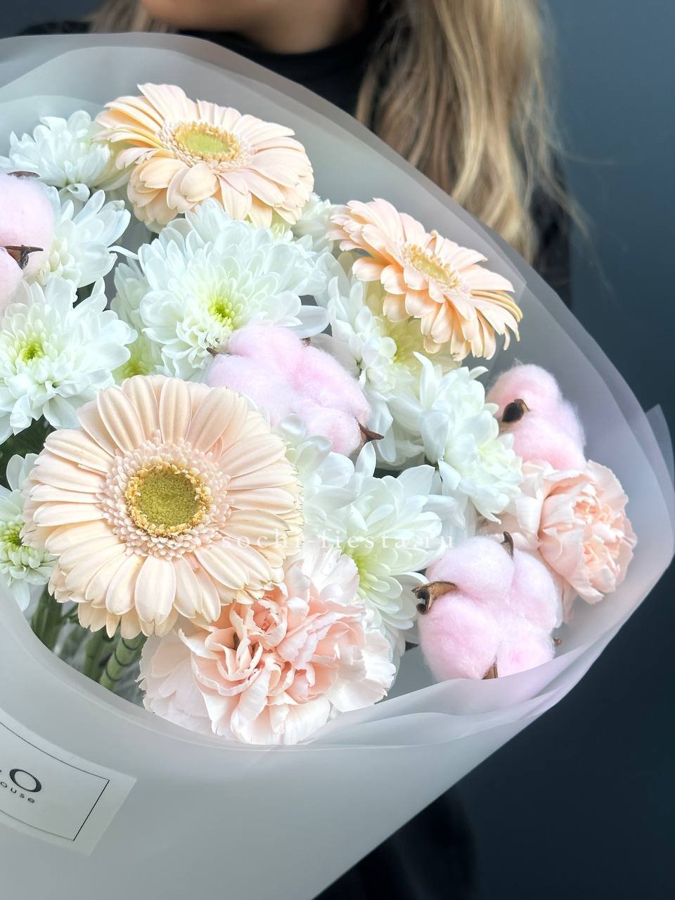пионы, гортензии, диантусы, маттиола лента и дизайнерская пленка.