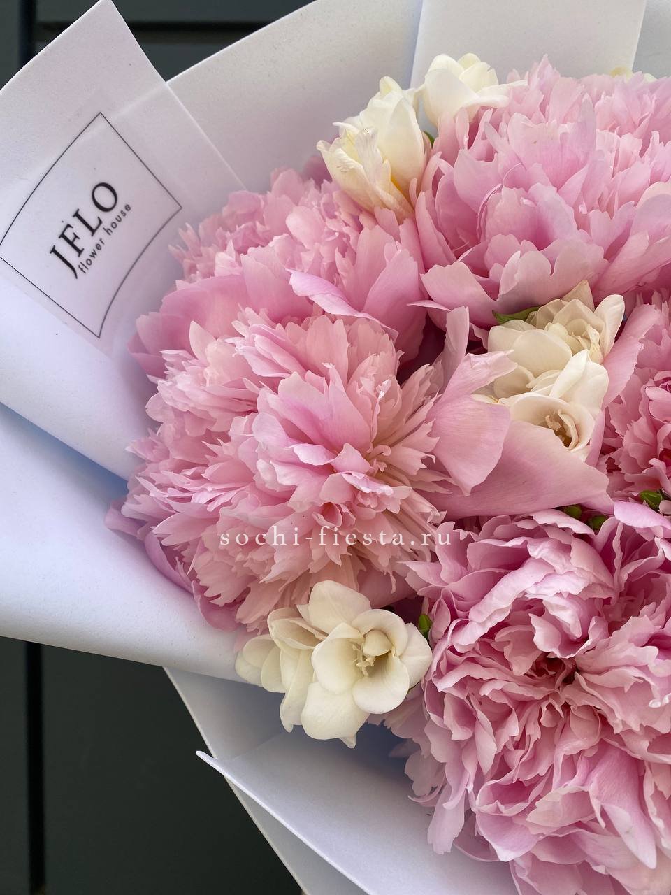 Пышные пионы встречаются с воздушными фрезиями в букете, который радует глаз многослойной структурой. Лепестки раскрываются постепенно, создавая живую композицию с выразительной глубиной.