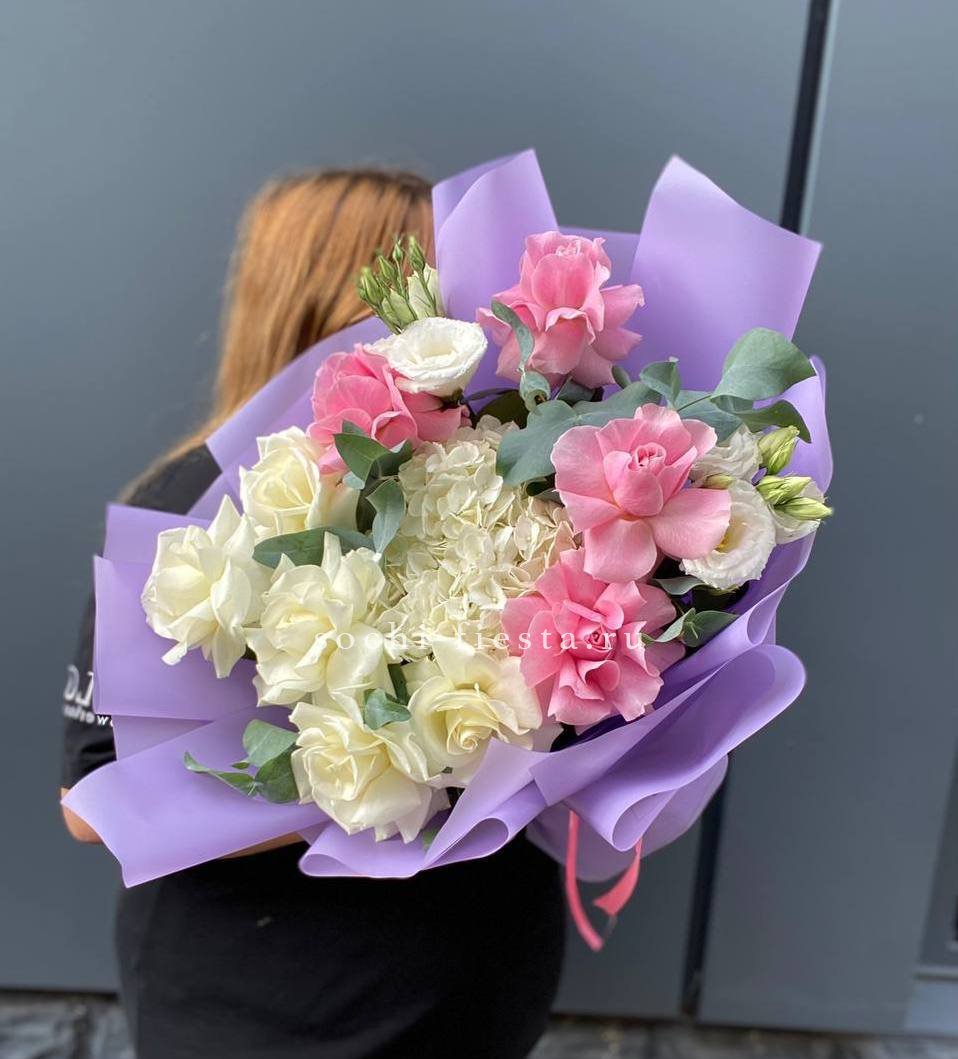 гортензия, эустома, диантус, мисти баблс, озотамус в нежном оформлении.