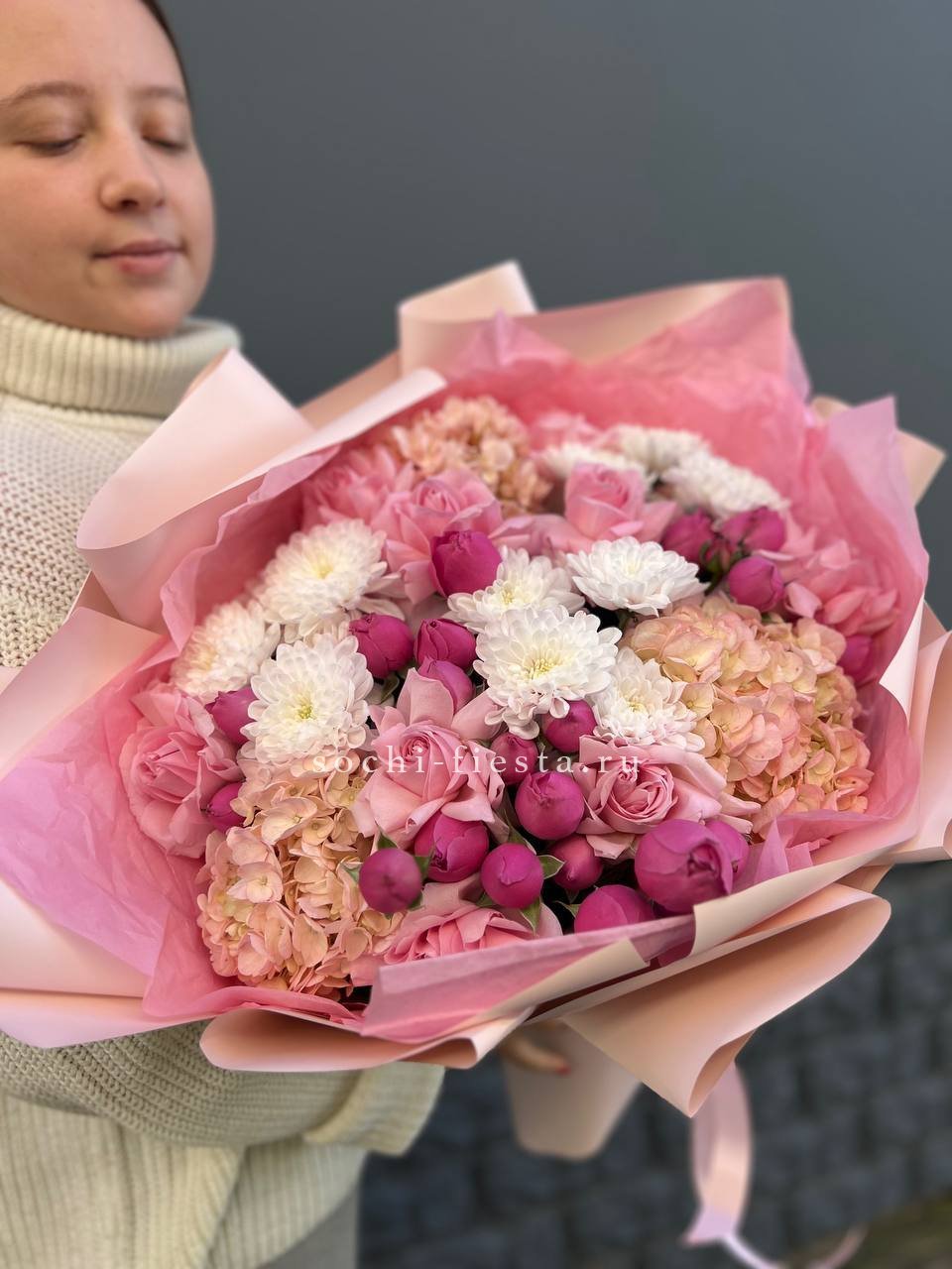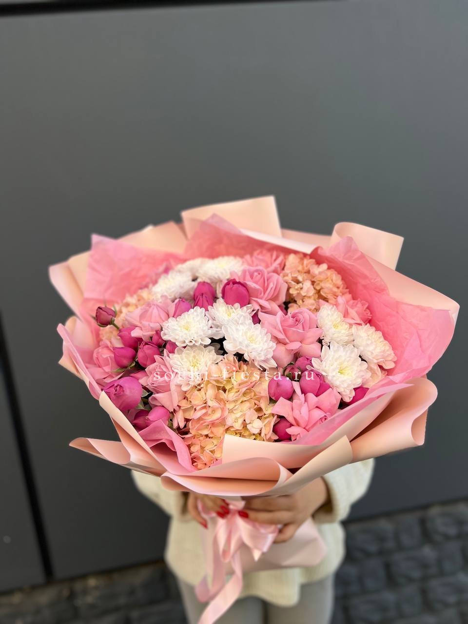 Пышные шапки гортензии создают воздушный объём, а белые розы добавляют графичности. Букет держит форму и легко размещается в любом пространстве.