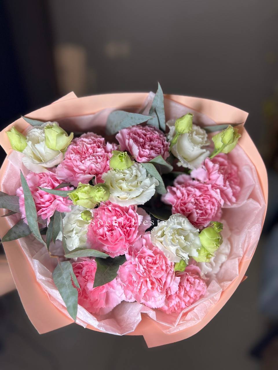Для заказа товара "Букет гвоздик и эустом "Сири"" с доставкой в Нижнекамске нажмите в корзину