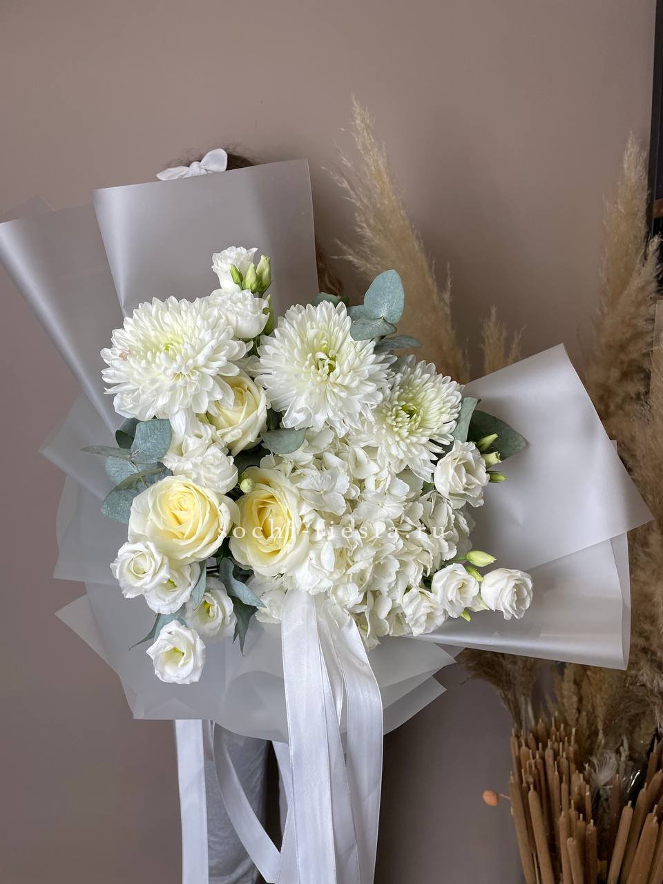 хризантема кустовая, диантусы, эвкалипт, оформление.