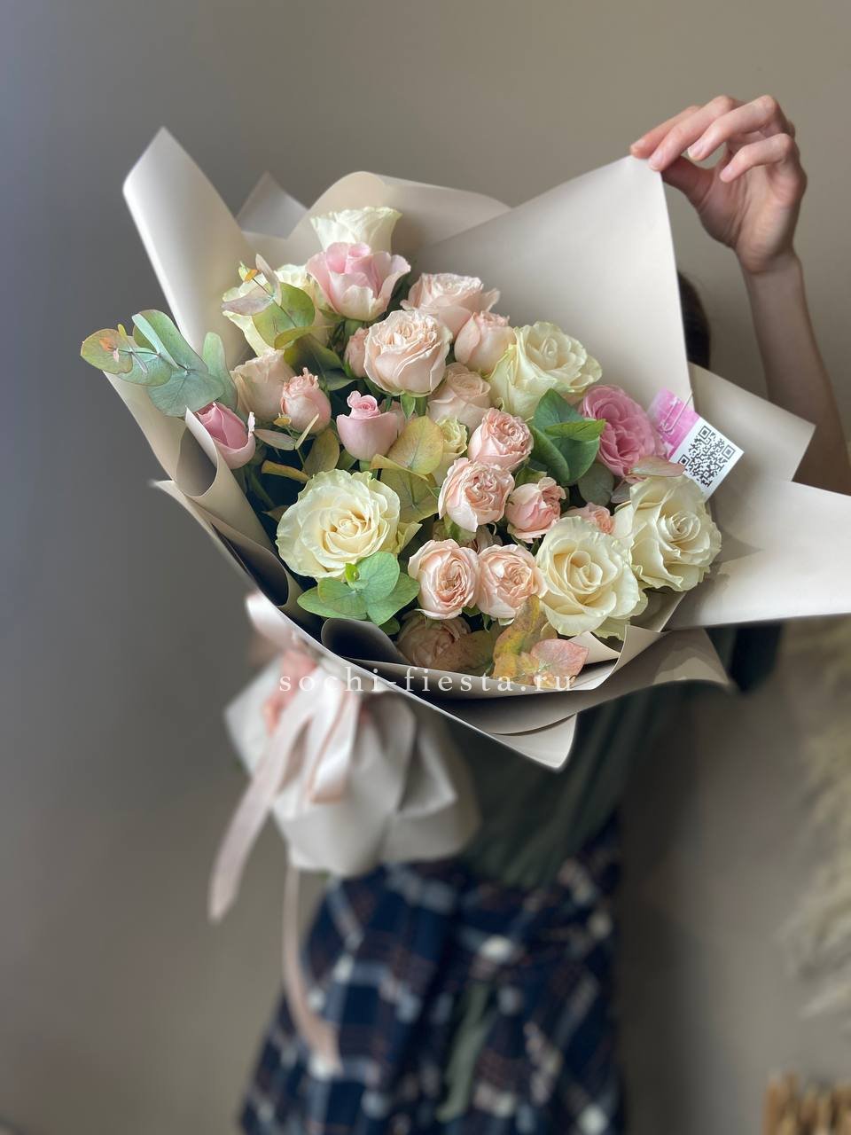 кустовые розы Джульетта и диантусы в нежном оформлении.