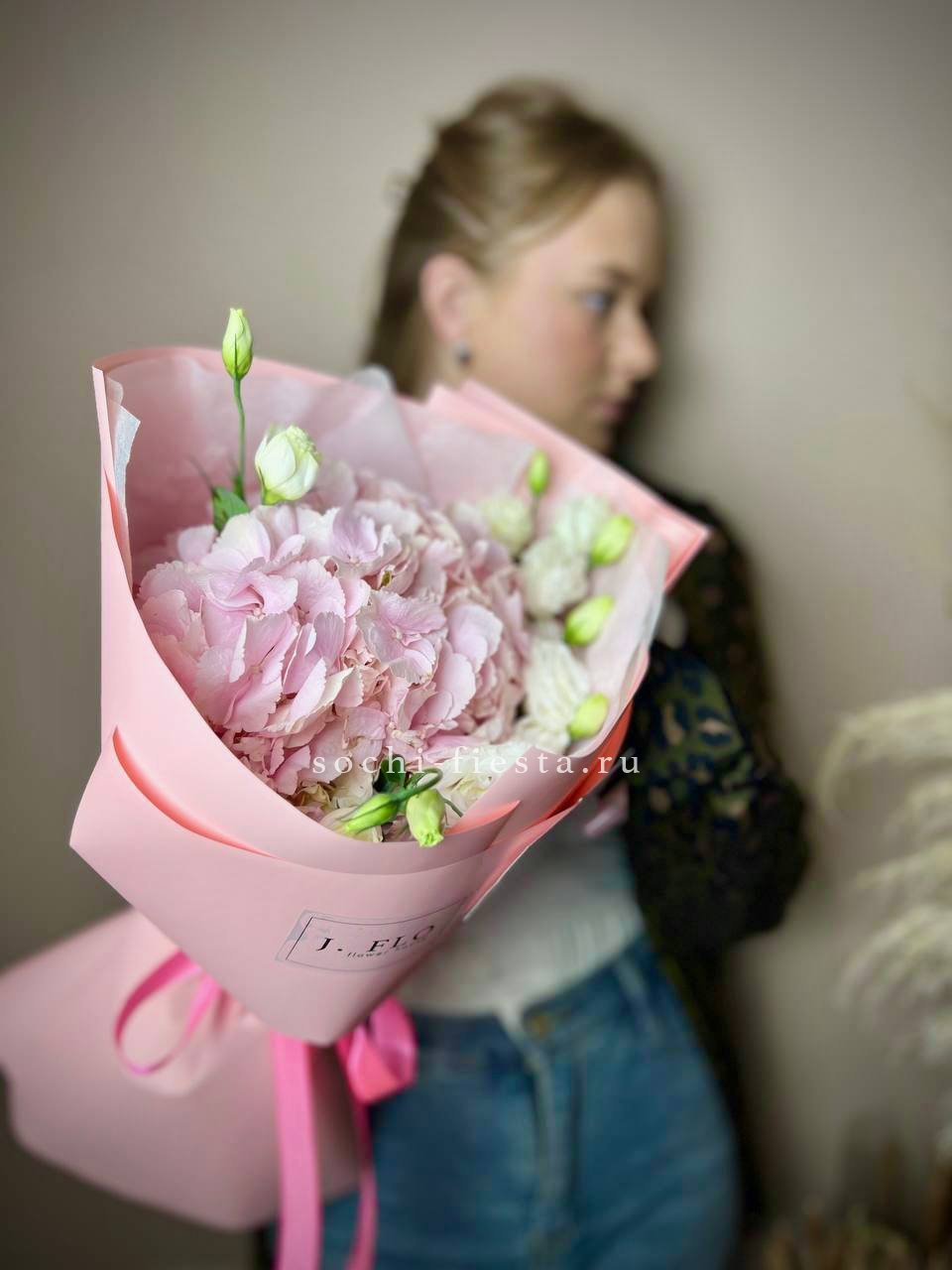 гортензия, хризантема, хамелациум, гербера, мисти баблс, диантус, пленка.