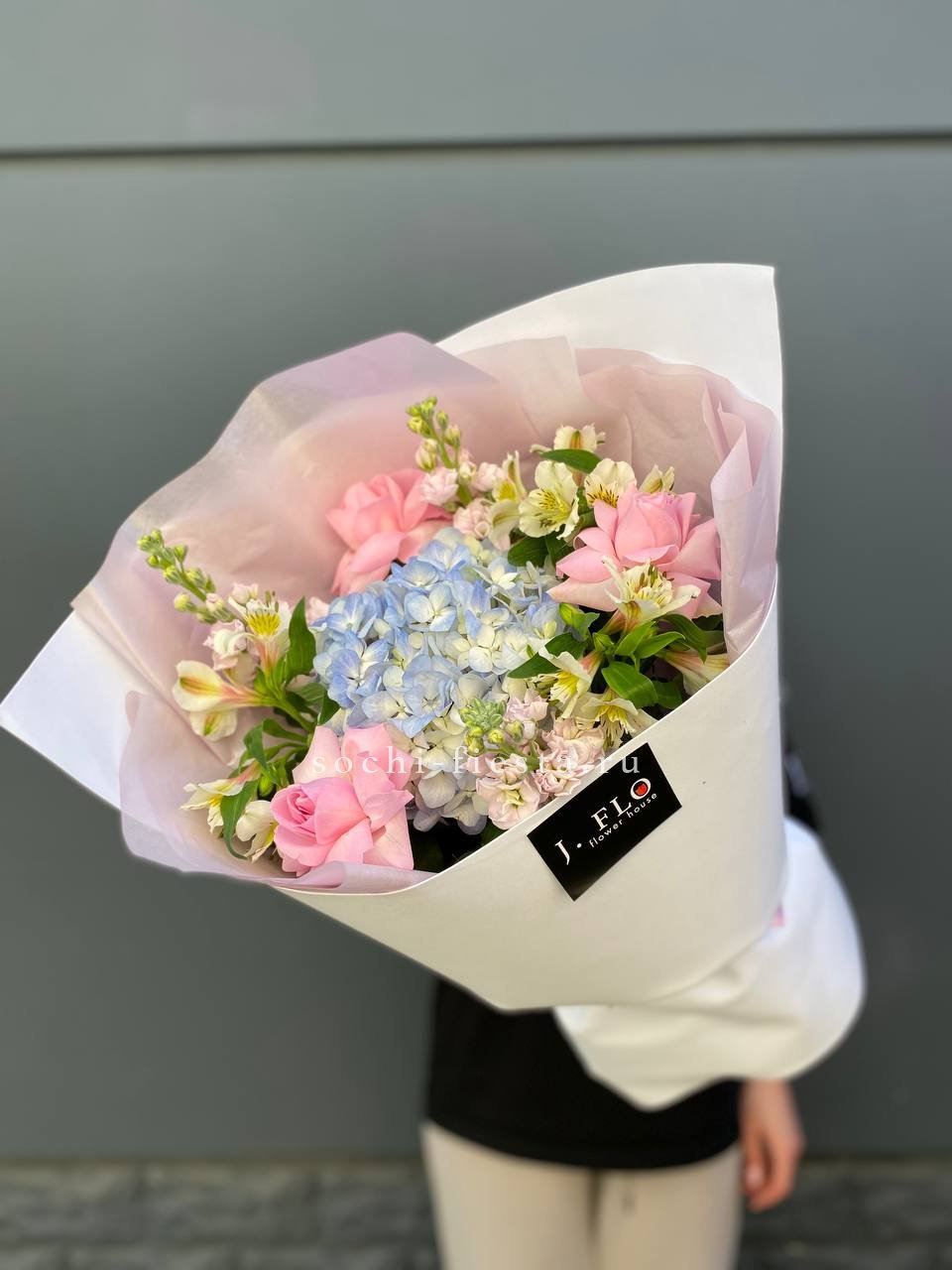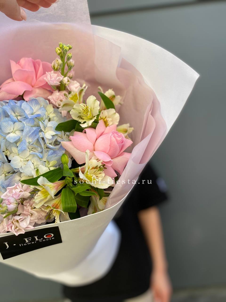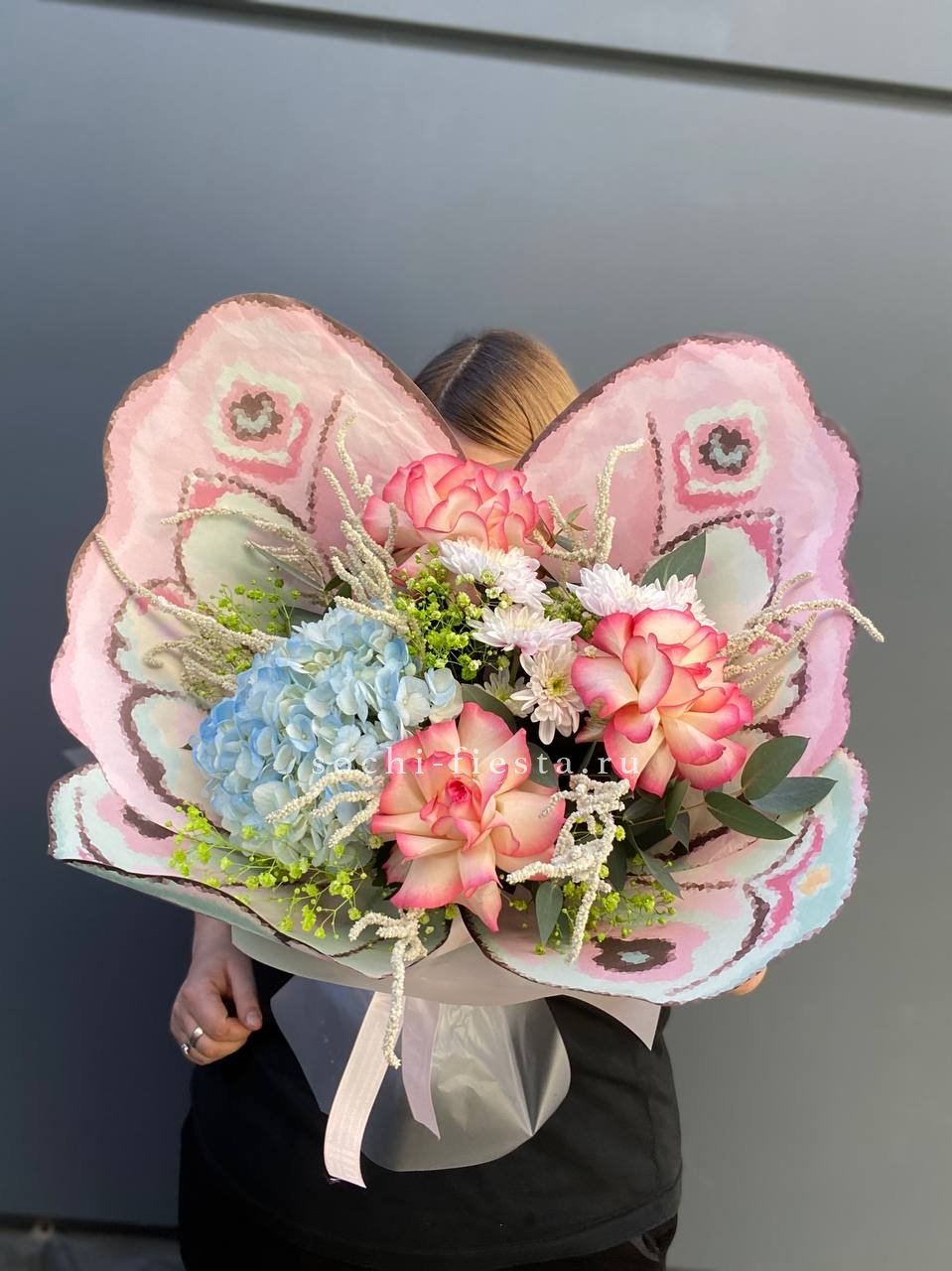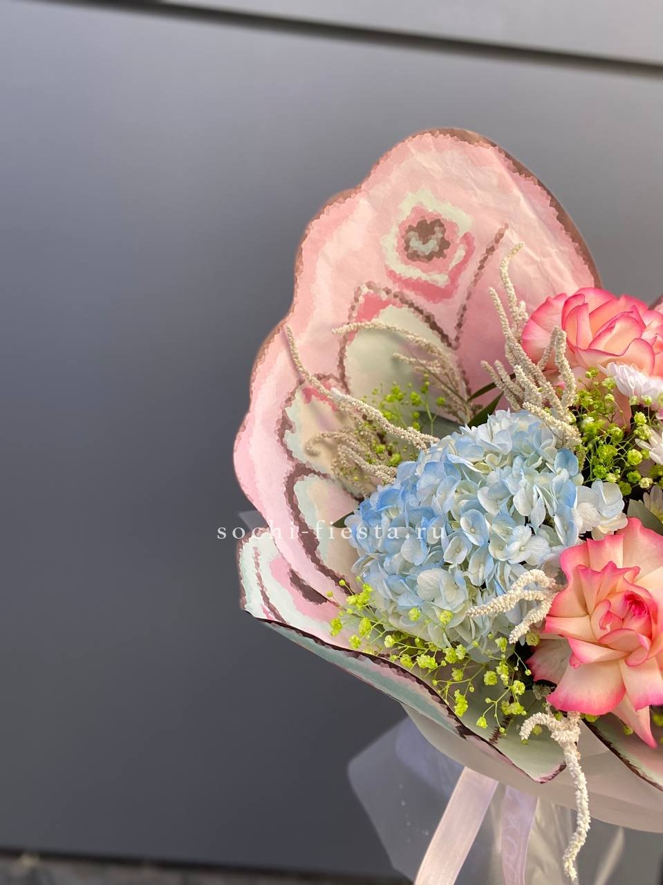 гортензия, диантус, хризантема, эустома, розы, озатамус, пленка.