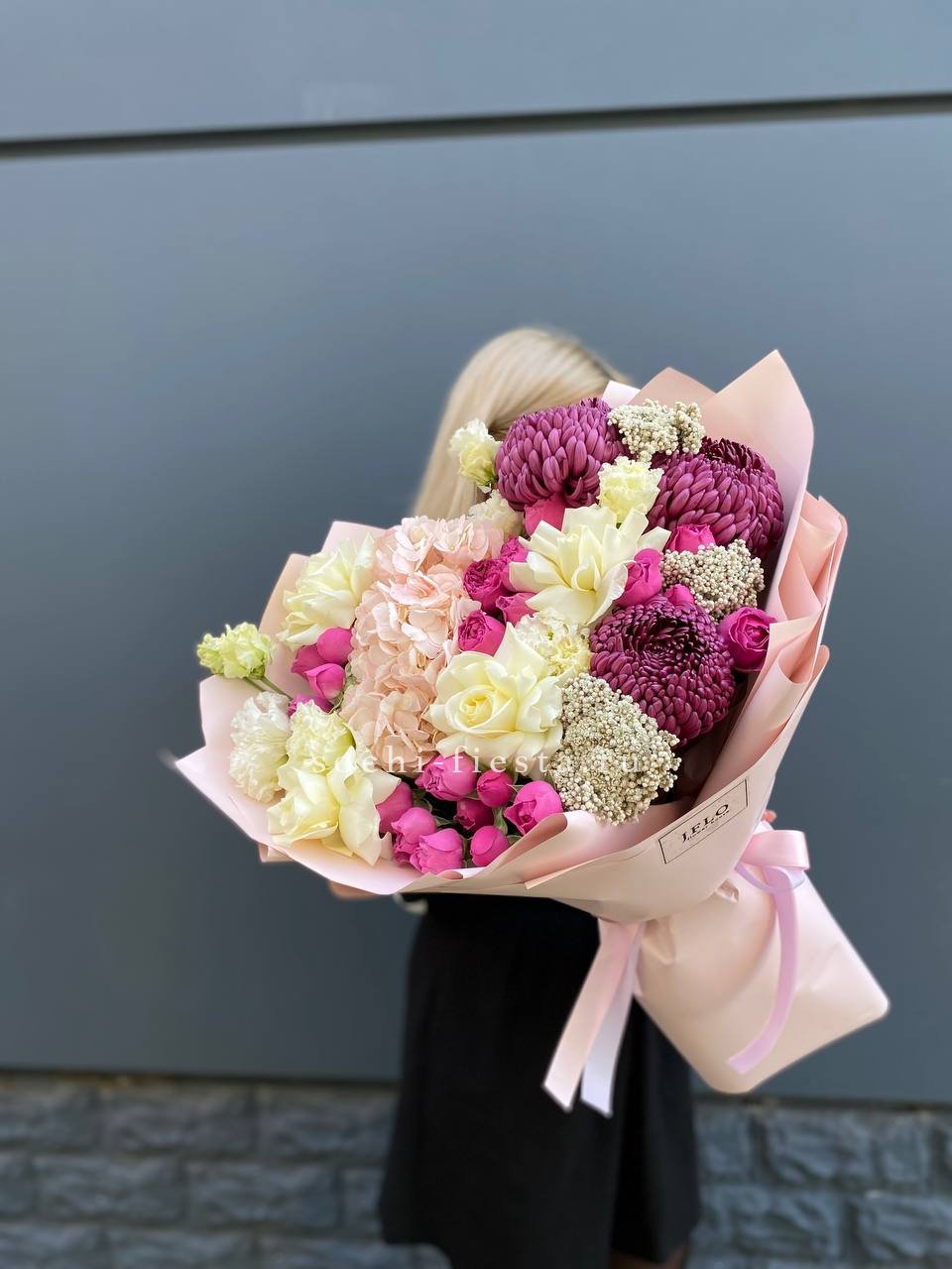 бигуди, гортензия, мисти баблс, розы, эустома, озотамус в нежном оформлении.