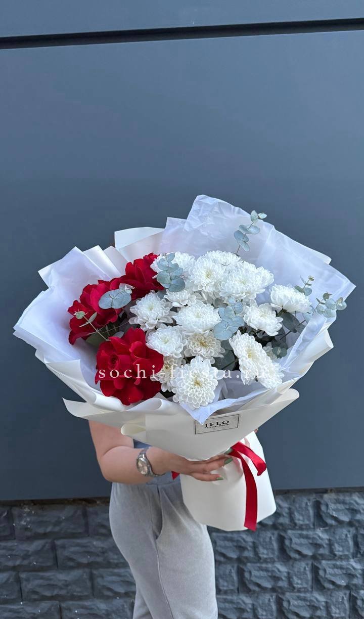 диантус, гербера, кустовая роза, роза белая, лимониум (замена в несезон), дельфиниум/маттиола/львиный зев/гладиолус (замена в несезон), лента, авторская упаковка.