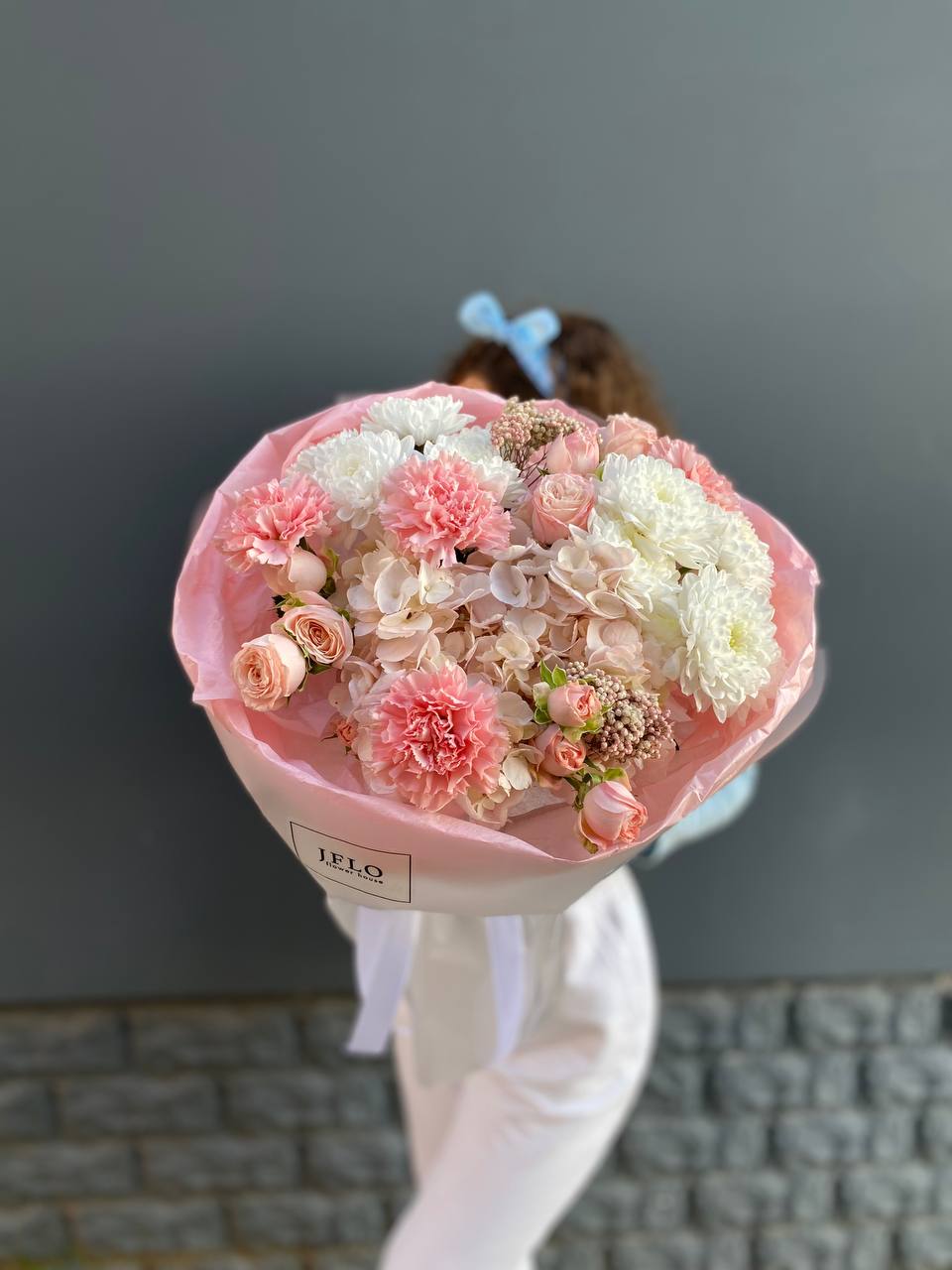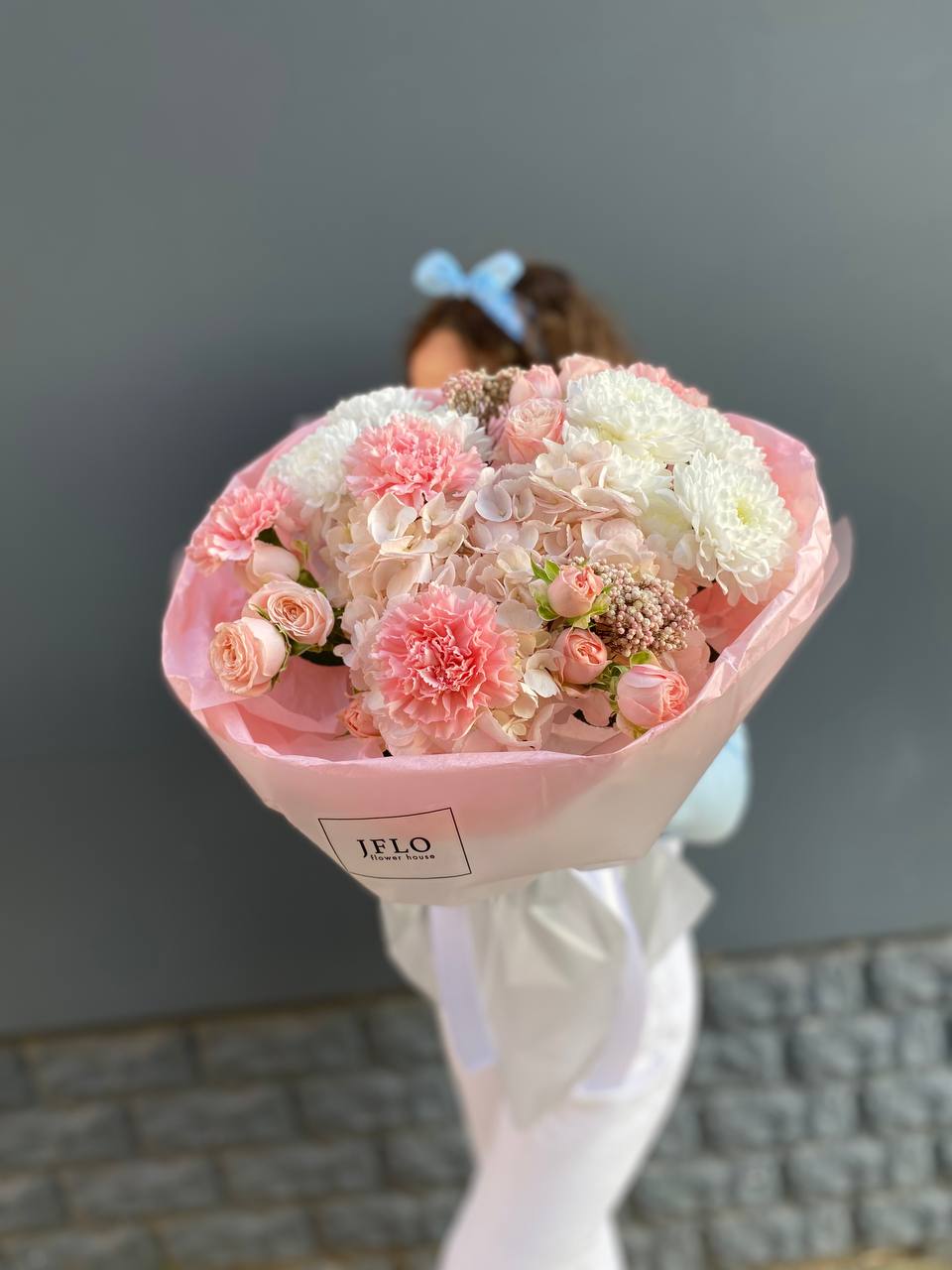 гортензия, белая роза, диантус, хризантема, эустома, озатамус, пленка.
