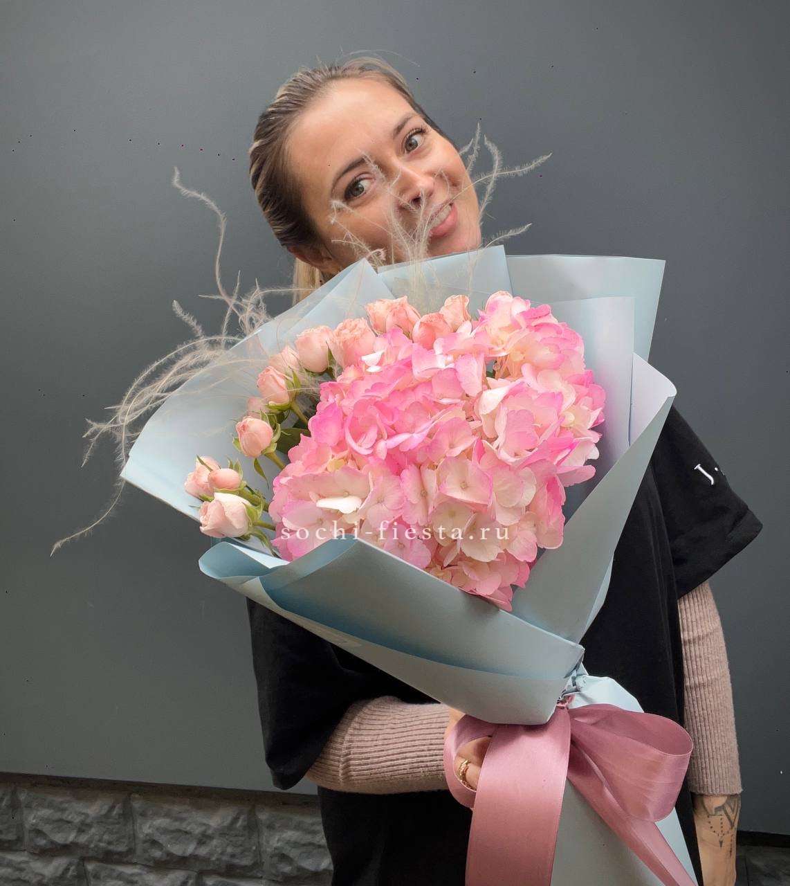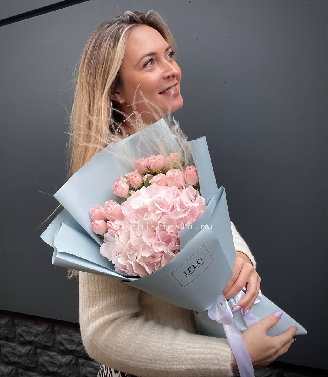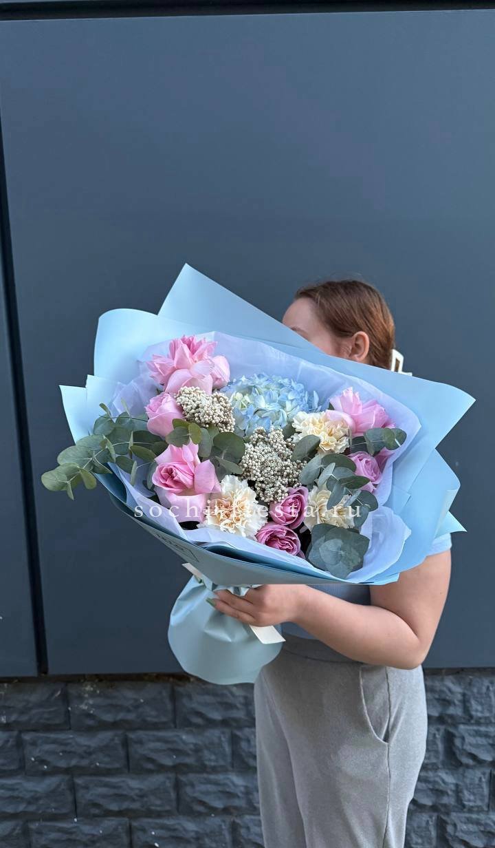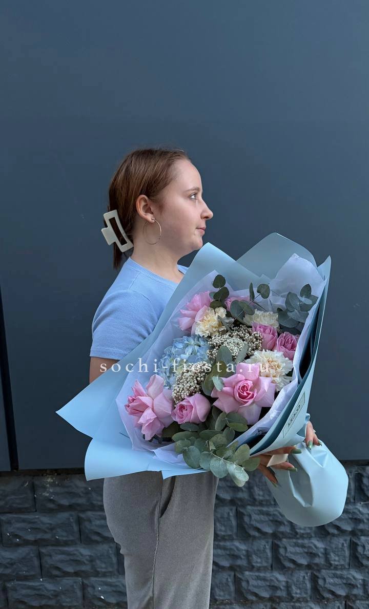 Воздушная композиция с крупными соцветиями гортензии и пышными розами создает ощущение легкости и объема. Эвкалипт добавляет свежести, а бомбастик расставляет яркие акценты между бутонами.