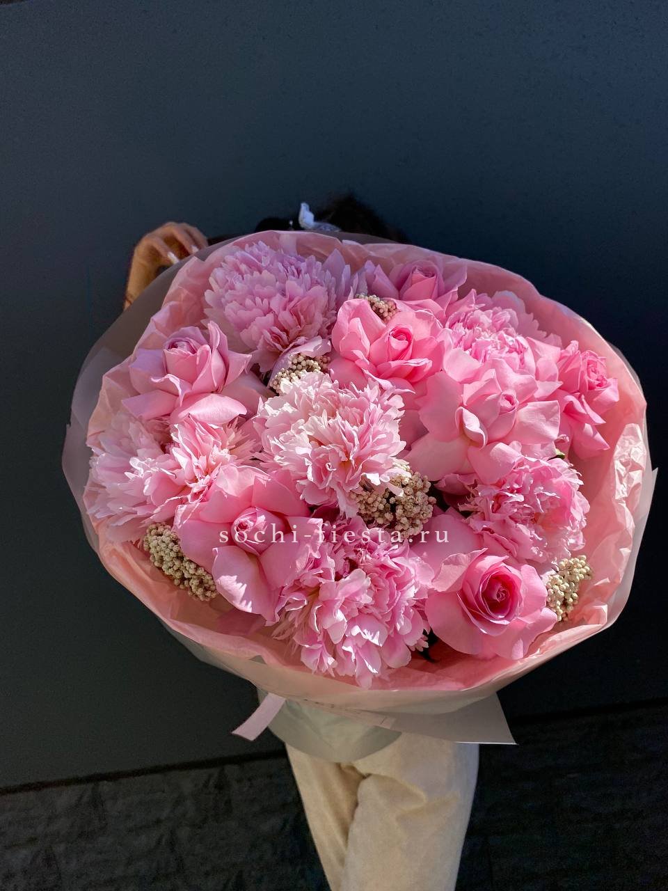 Плотные бутоны пионов собраны с розами в объёмную форму с мягким силуэтом. Озотамус добавляет воздушную текстуру по краям. Композиция в розовой гамме держит форму и выглядит цельно.