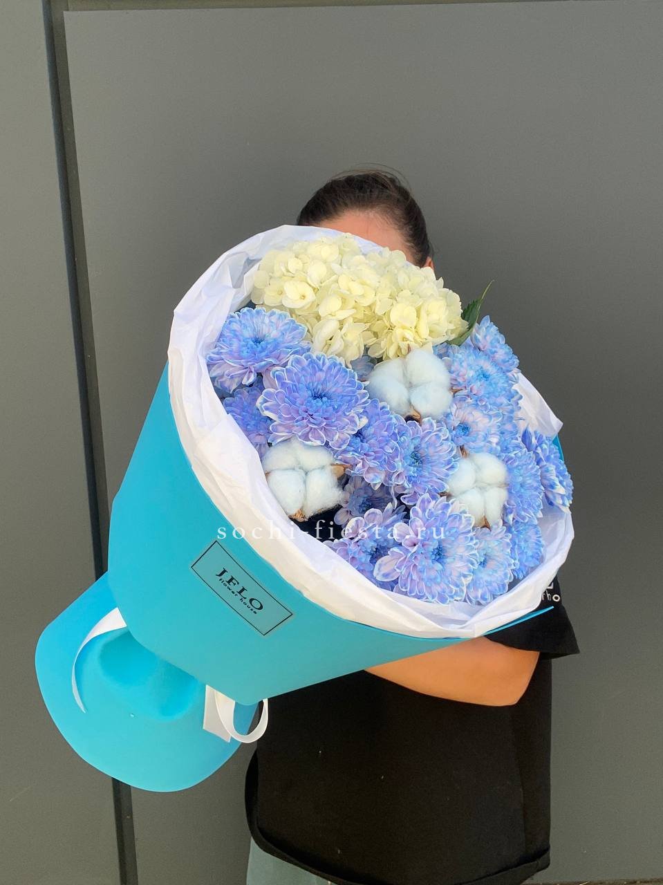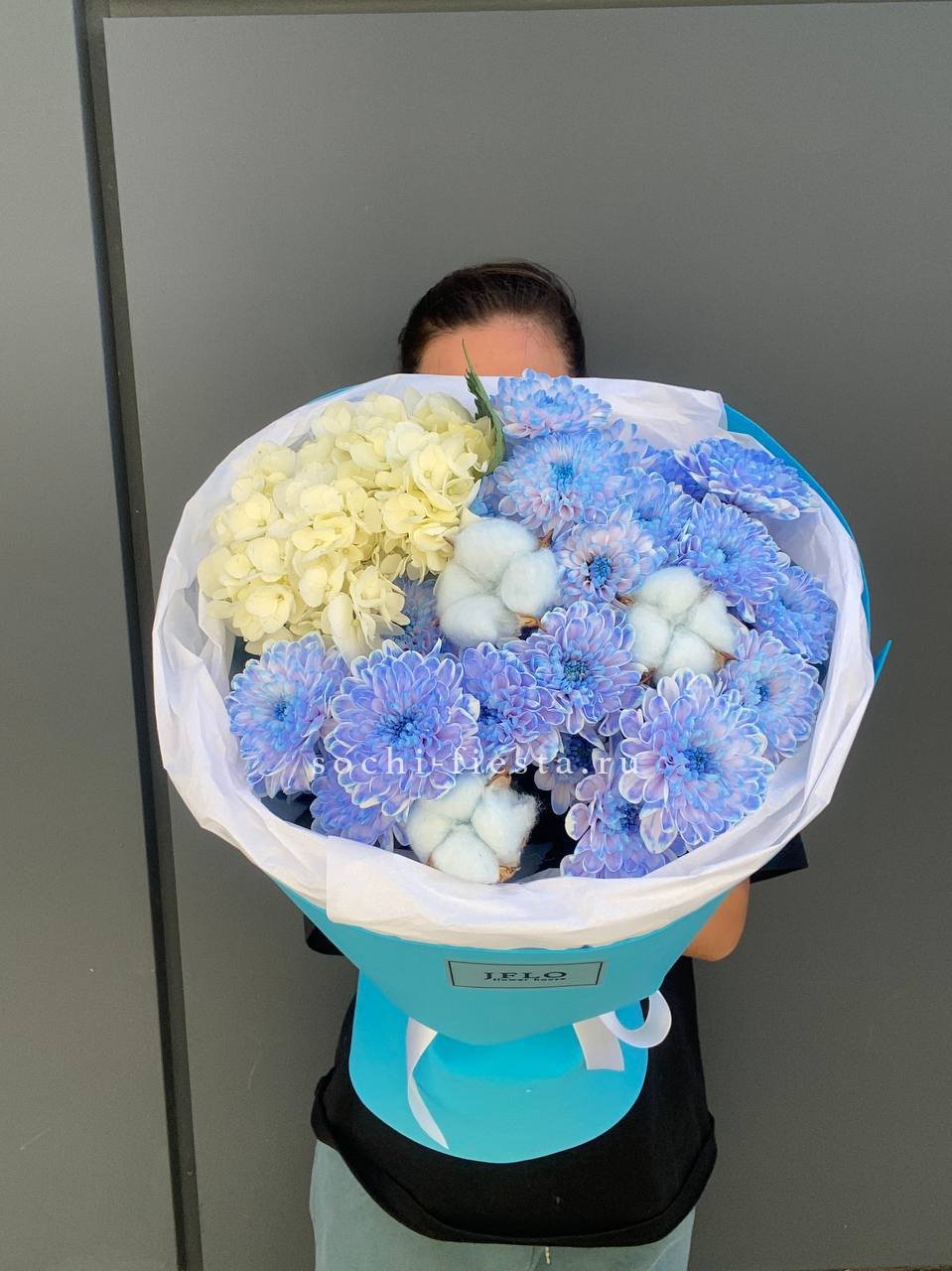орхидея, гортензия, гербера, диантус, пионовидная роза бомбастик,  эвкалипт, лента, дизайнерская пленка.