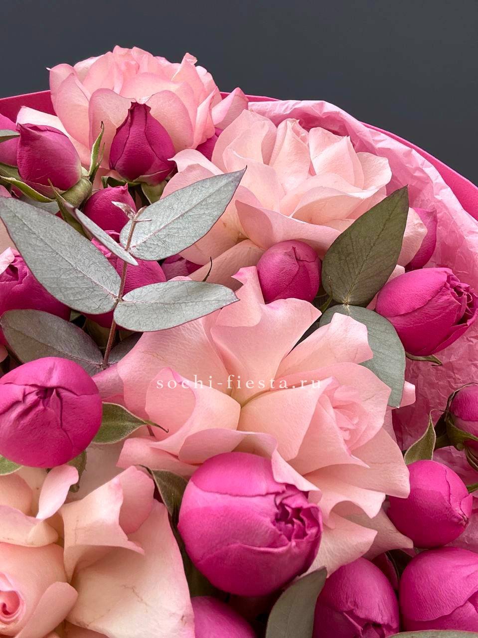 розы, гортензия, альстромерии, маттиола лента и дизайнерская пленка.
