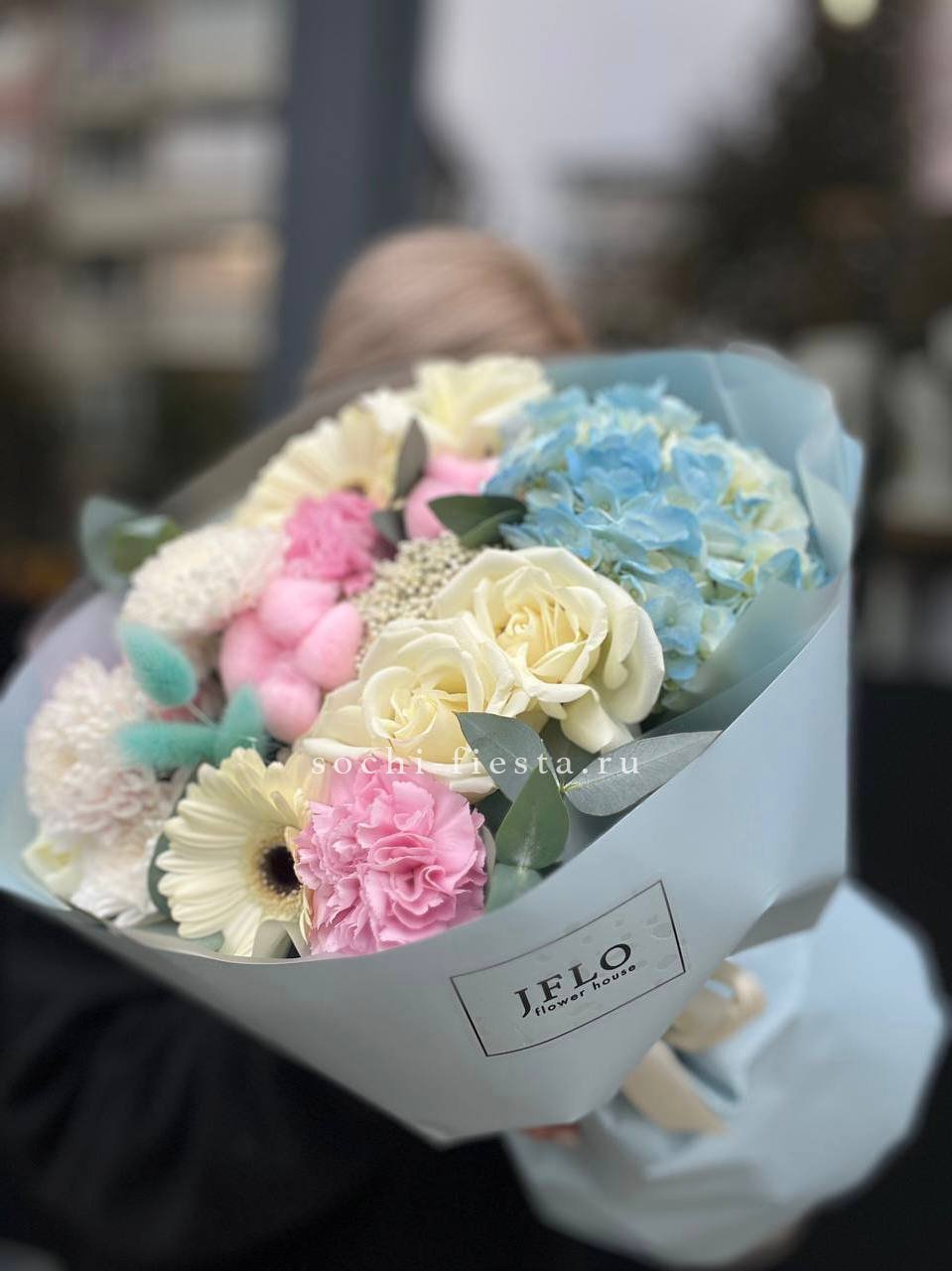 Яркие герберы встречаются с розами и хризантемами в плотной композиции. Гортензия добавляет объём, а хлопок создаёт мягкую текстурную волну по краю букета.