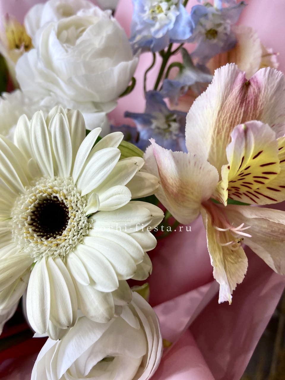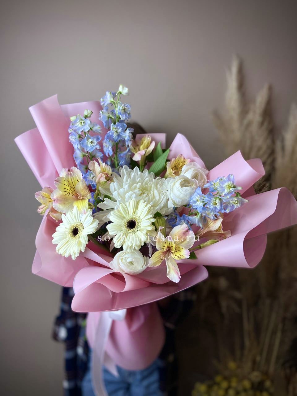ранункулюс, гербера, альстромерия, хризантема, дельфиниум, авторское оформление.