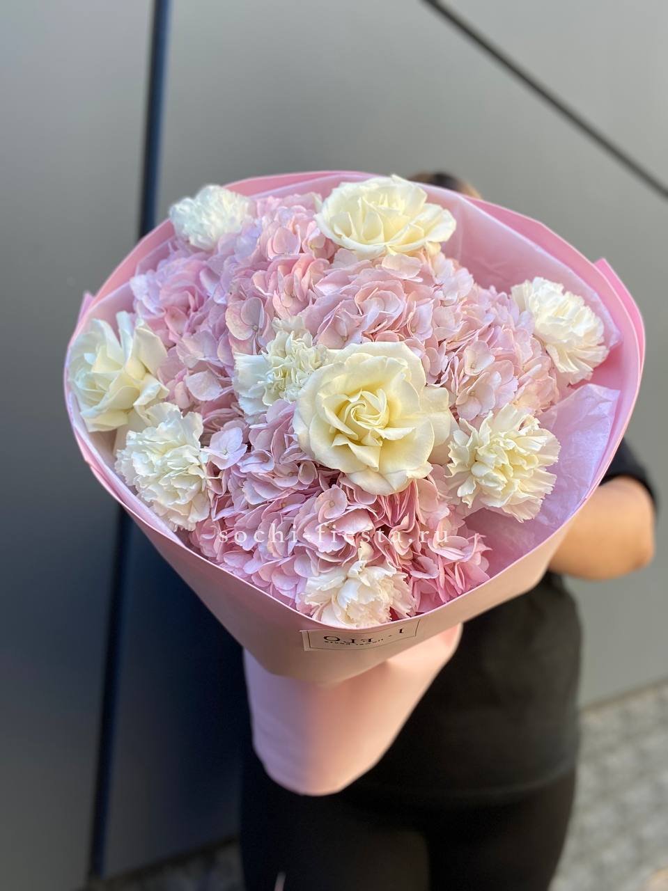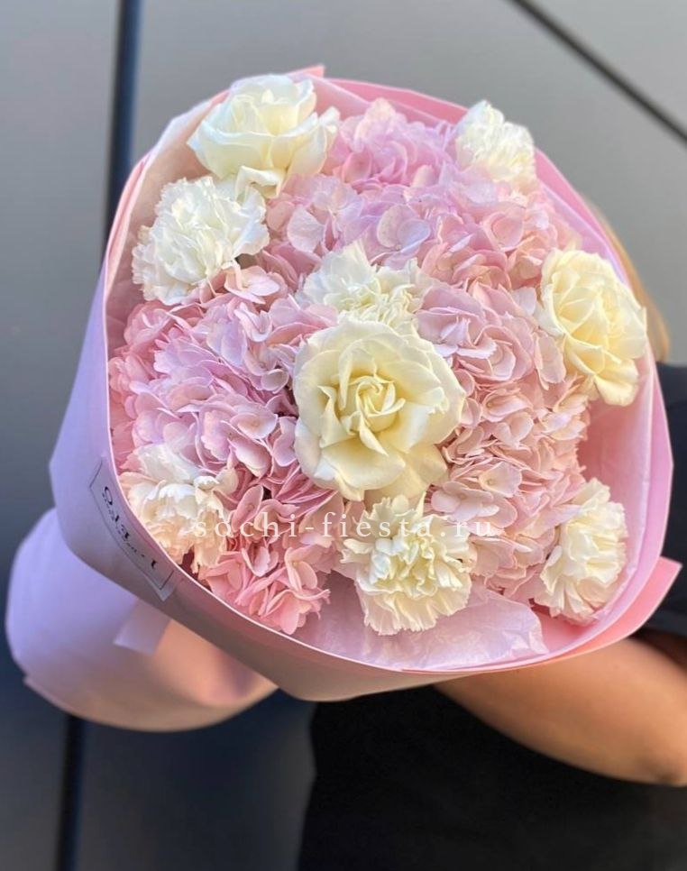 гортензия, кустовая роза, розовая роза, дельфиниум/маттиола/львиный зев, амарантус, эвкалипт или аналог, декор, корейская пленка, лента.