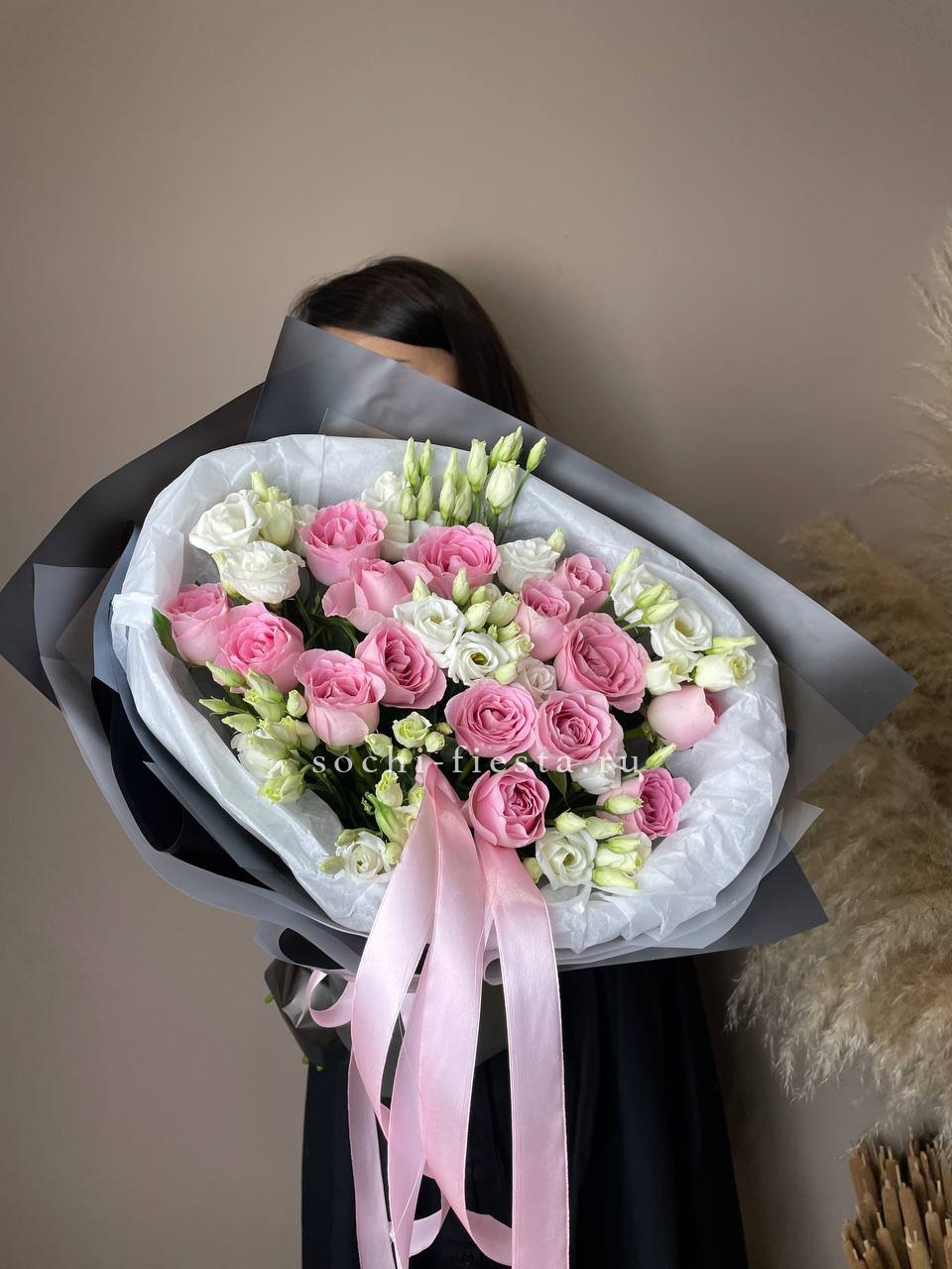 гортензия, диантус, кустовая пионовидная роза, эустома, вспомогательные цветы, эвкалипт, лента, дизайнерская упаковка.