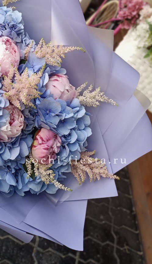 пионы, гортензия, статица (или аналог), лента, дизайнерская упаковка.