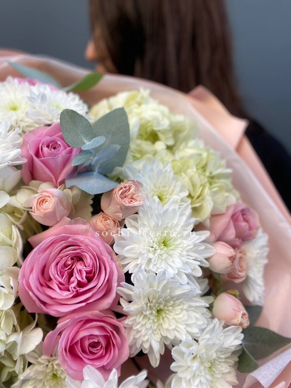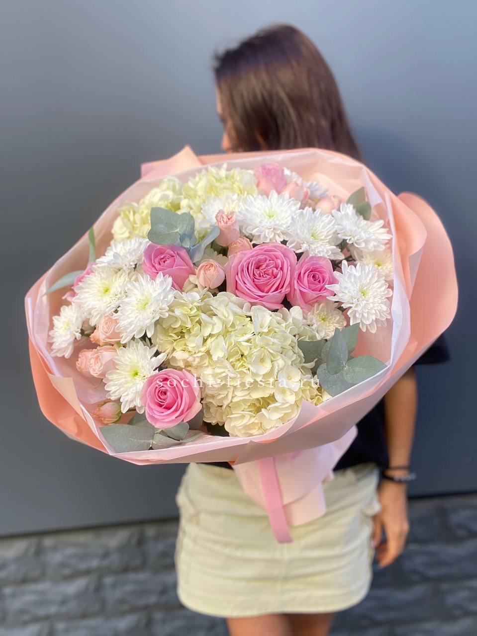 гортензия, розы, диантусы, хризантема, пионы (или пионовидные розы), эустома, корзина. Состав может меняться, в зависимости от сезона.