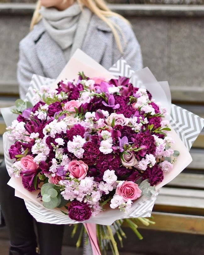 Диантусы и фрезия наполняют пространство лёгким ароматом, а маттиола добавляет вертикальные линии. Розы и эвкалипт создают объёмную композицию, которая притягивает взгляд своим присутствием.
