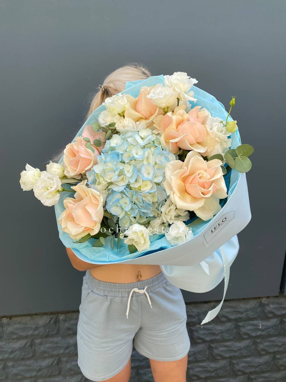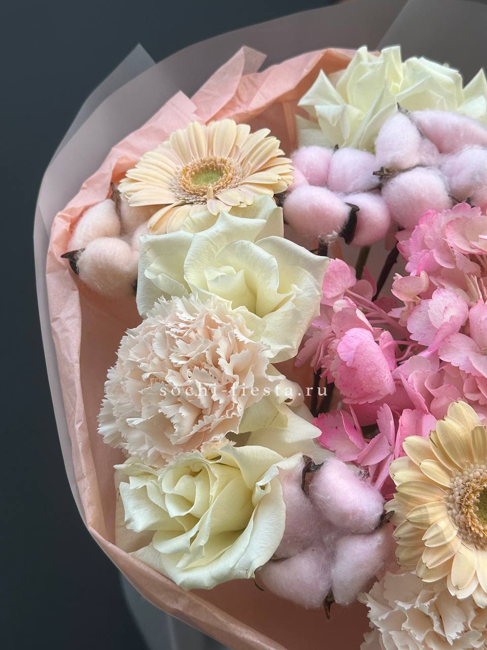 Кремовые розы окружены облаками гортензии, а эустома расставляет светлые акценты по краям. Букет держит форму и при этом выглядит объемно благодаря многослойной сборке.