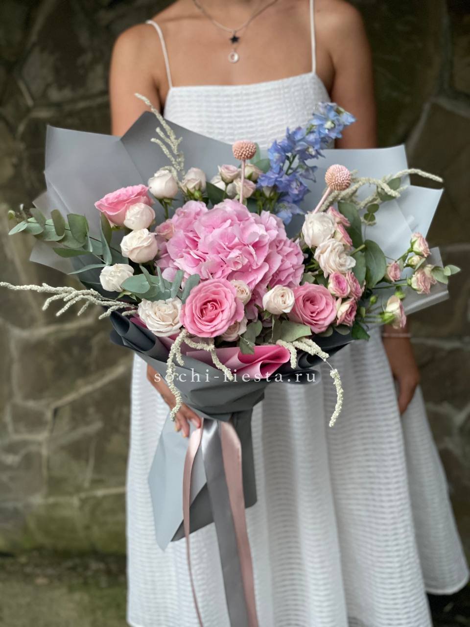 Букет объединяет хризантемы, диантусы, розы, эустому и гортензию в плотную композицию. Корейская пленка удерживает форму и создает графичный силуэт с четкими границами.