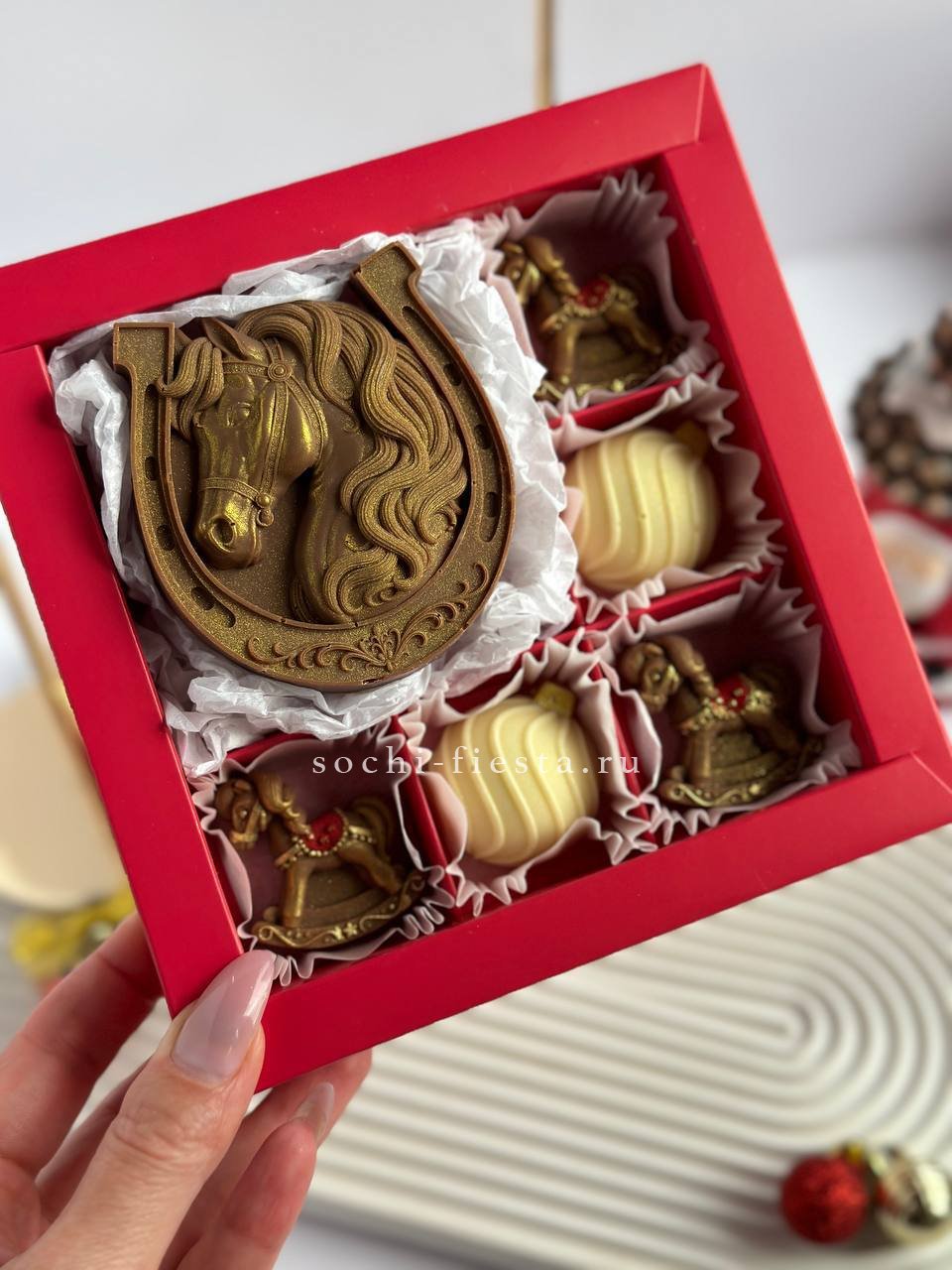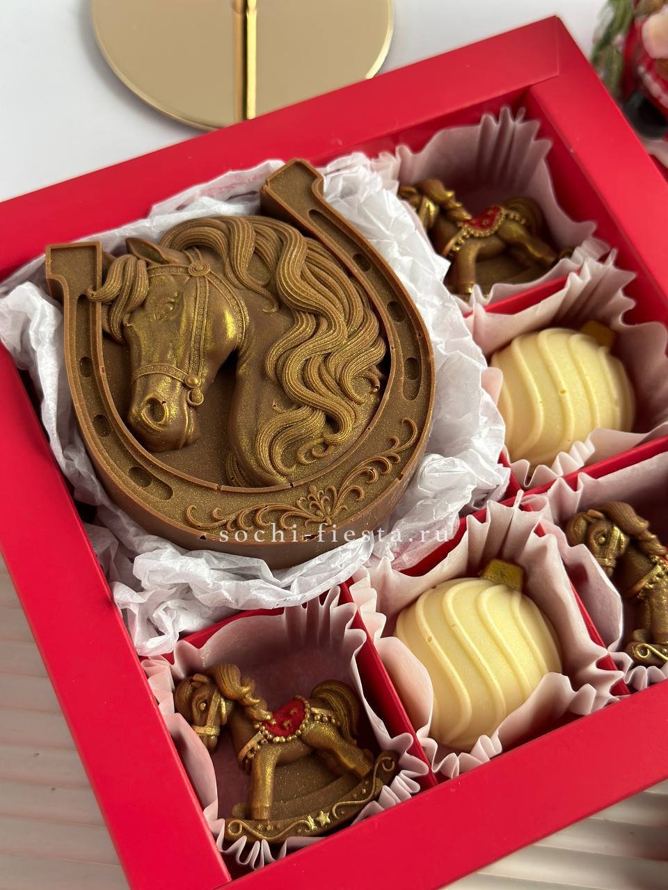 Шесть расписных шоколадных фигурок с подковой на удачу собраны в один набор. Бельгийский шоколад и ручная роспись превращают угощение в памятный сувенир высотой 14 см.