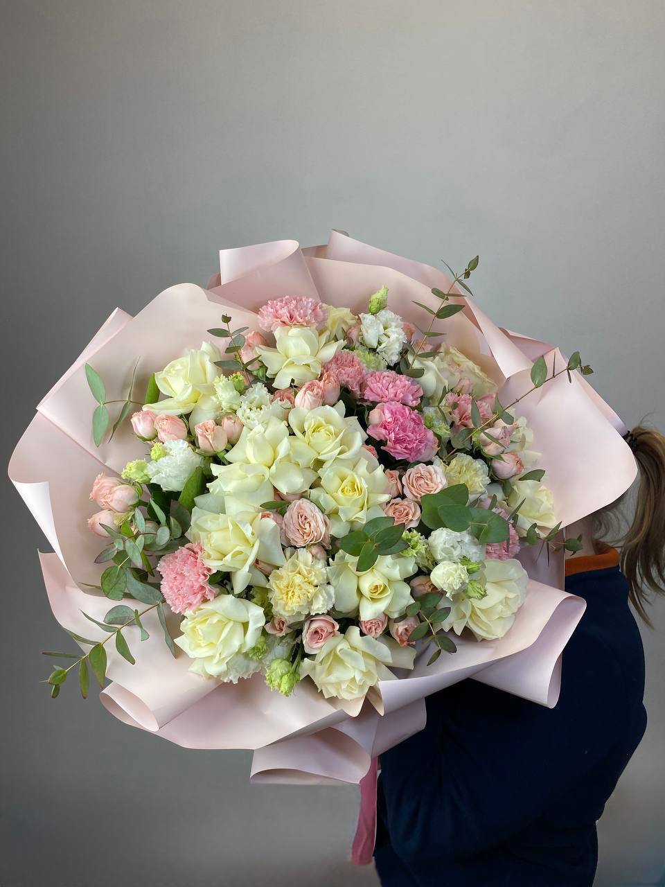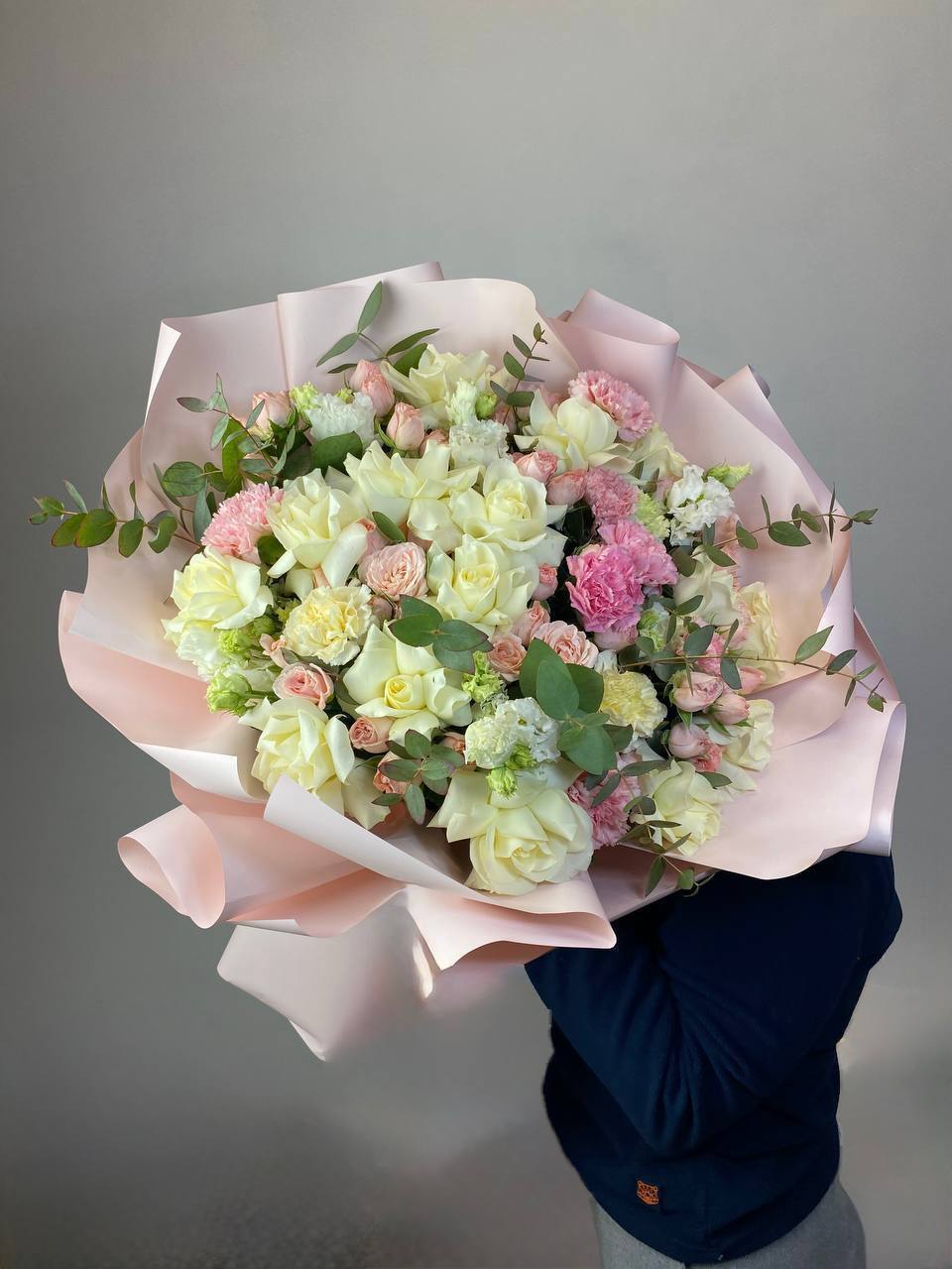 кустовые пионовидные розы Бомбастик, эвкалипт, цилиндр D13, бумага тишью, лента.