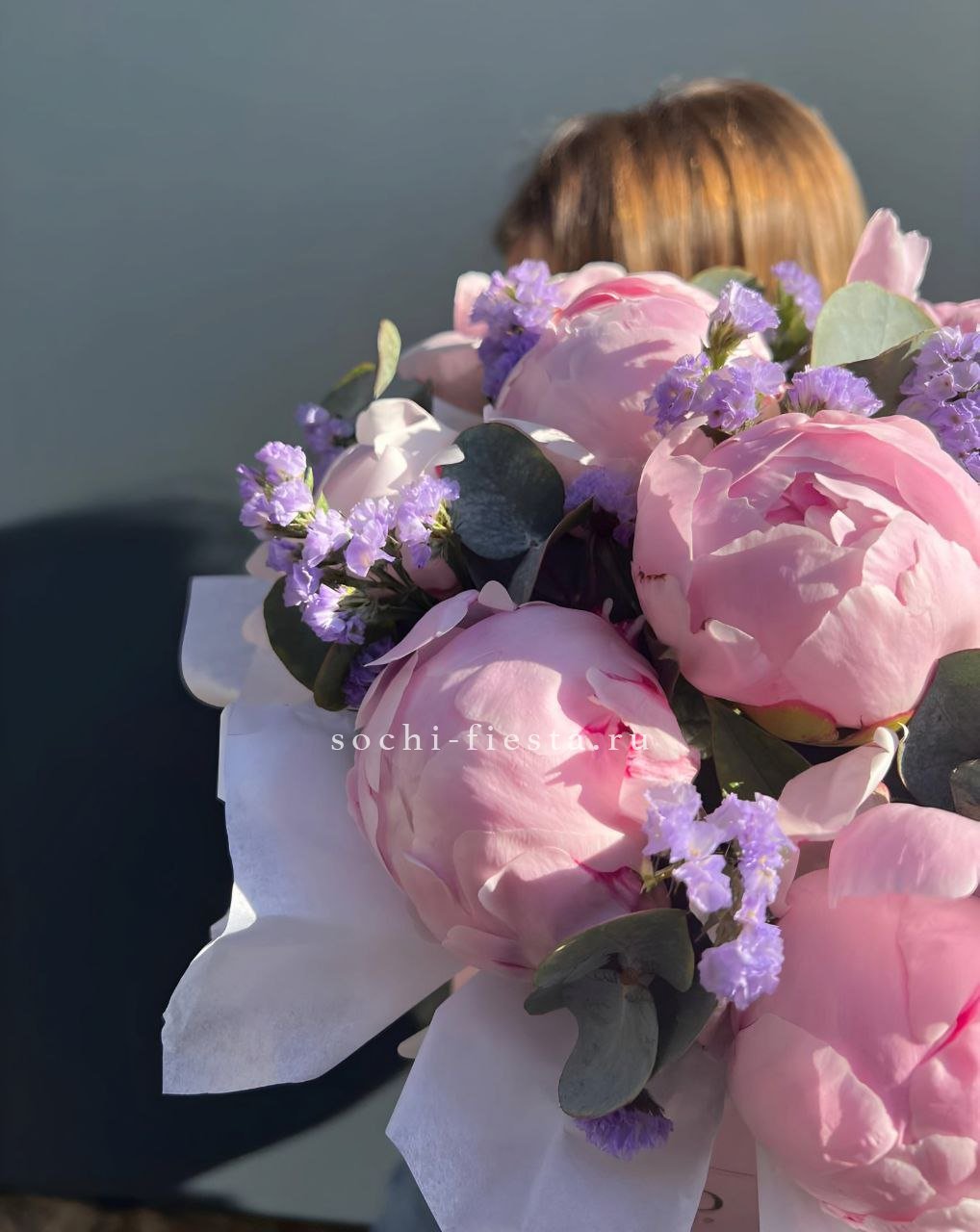 Пионы сочетаются с фиолетовыми соцветиями лаванды или статицы в цилиндре. Лавандовые оттенки создают прохладную гамму и освежают восприятие композиции.