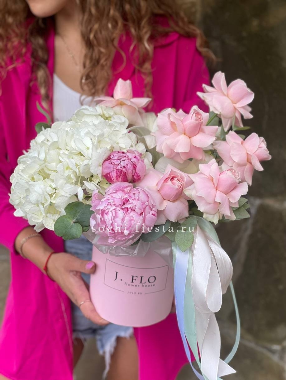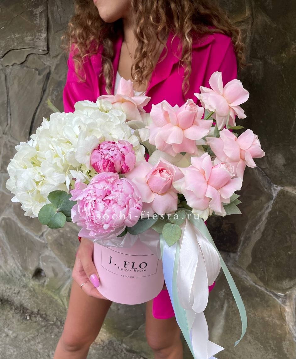 пион, розы одноголовые, гортензия, пионовидная роза, эвкалипт, тишью, коробка D13 Цвет коробки может быть согласован с заказчиком.