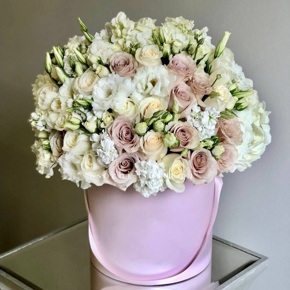 Пионовидные розы раскрываются пышными шапками среди воздушной гортензии и эустомы. Композиция собрана в круглом боксе и держит форму без дополнительной упаковки.