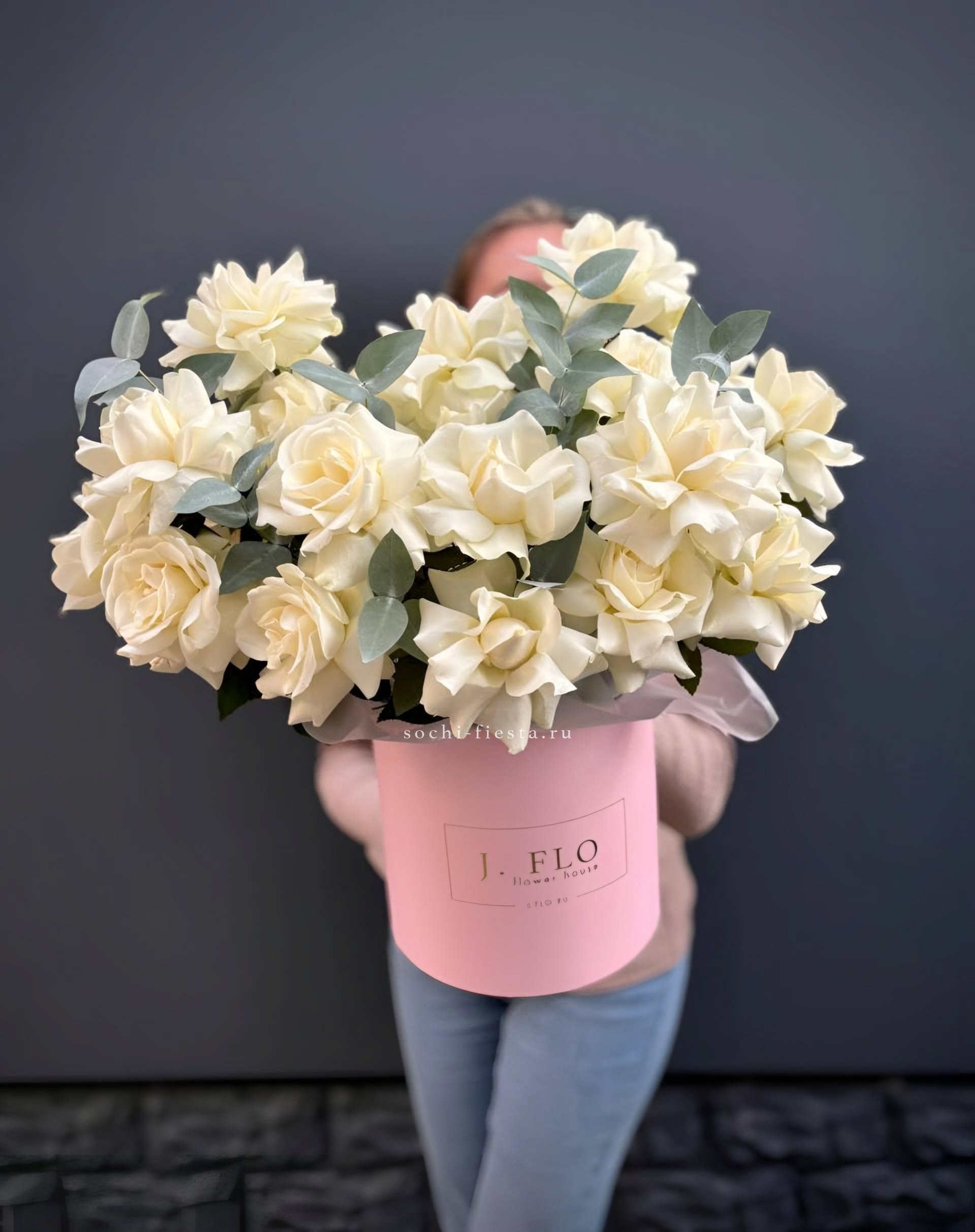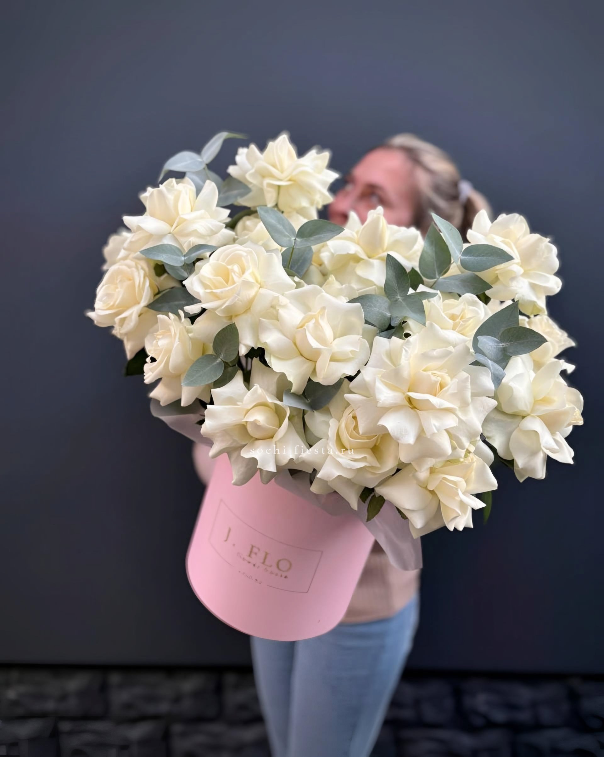 Двадцать семь бархатных роз собраны в плотную круглую композицию с серебристыми ветками эвкалипта. Шляпная коробка сохраняет свежесть и позволяет разместить цветы в любом уголке дома.