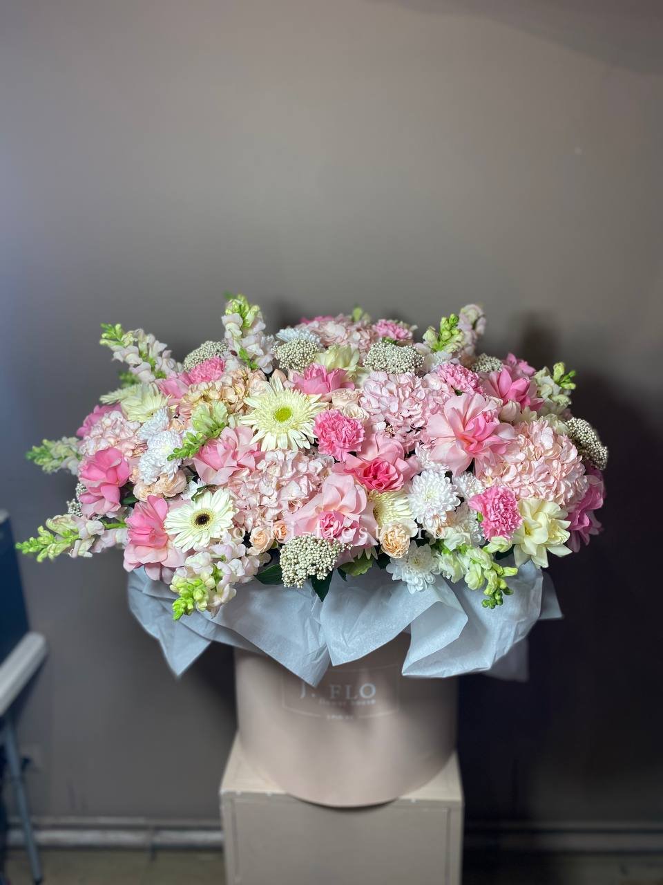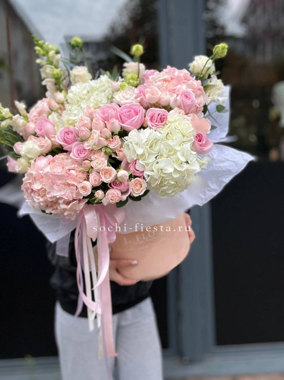 гортензии, эустома, розы, бомбастик, эвкалипт, антиринум в боксе 25.