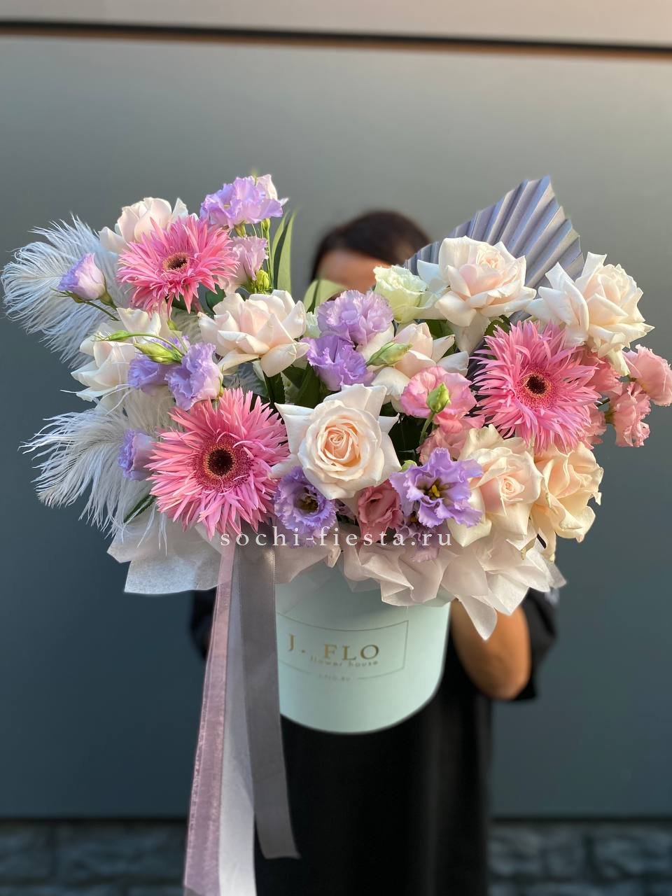 Французские розы переплетаются с герберами и эустомой в цилиндре большого диаметра. Объёмная композиция заполняет пространство и привлекает внимание сочной палитрой бутонов.