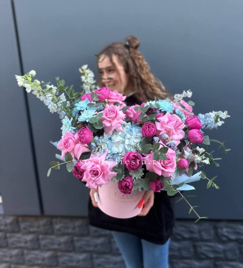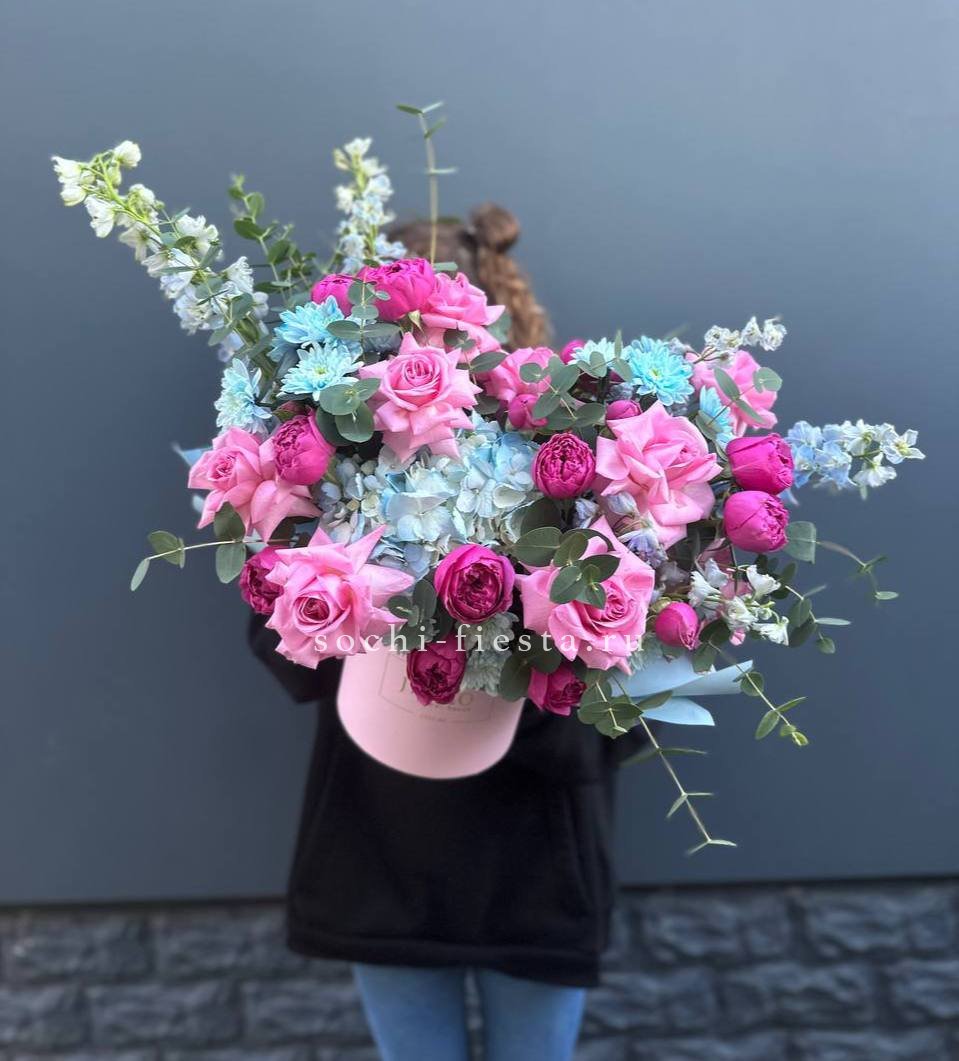 Композиция в светлом цилиндре выдержана в единой нежно-розовой палитре. Оттенки перетекают один в другой, создавая спокойное и цельное визуальное впечатление.