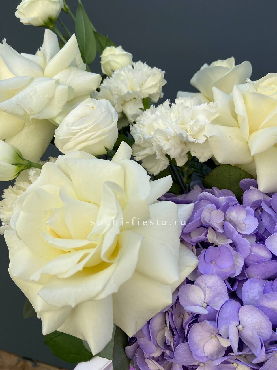 Белоснежная гамма раскрывается через лилии, розы и пышную гортензию с добавлением диантуса. Эвкалипт придает объём и глубину всей композиции в цилиндре.