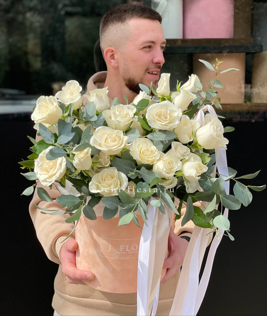 пионовидная кустовая роза, хлопок, одноголовая роза, кустовая хризантема, ковыль(стифа), эвкалипт, бокс D25.