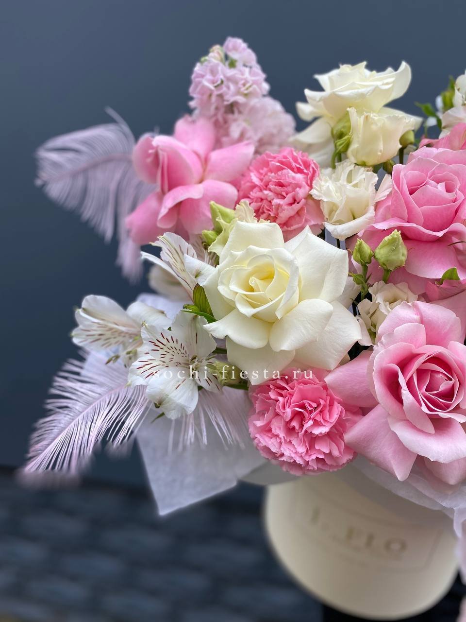 французские розы, альстромерии, маттиола, эустома, амарантус, перья.