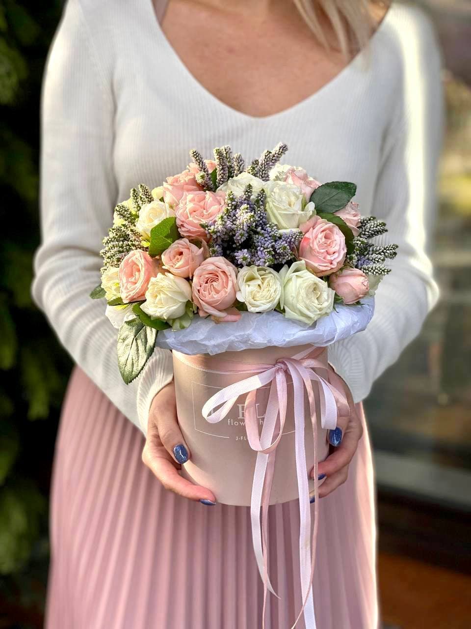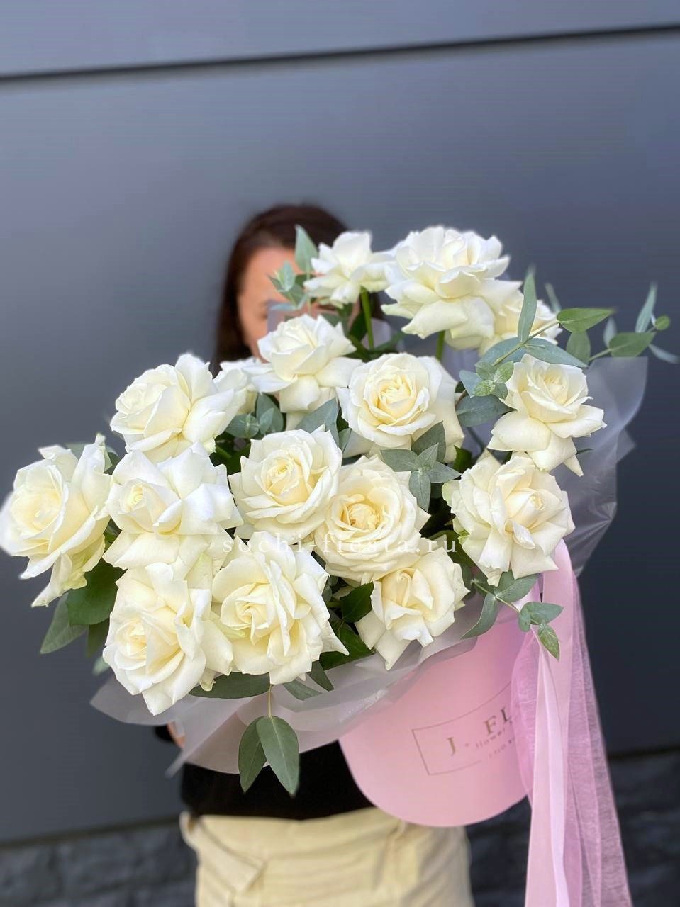 Семнадцать белых роз с раскрытыми лепестками собраны в круглый бокс с добавлением эвкалипта. Композиция держит форму и легко размещается на столе или комоде. Практичное решение для тех, кто ценит аккуратность и свежесть без лишних деталей.